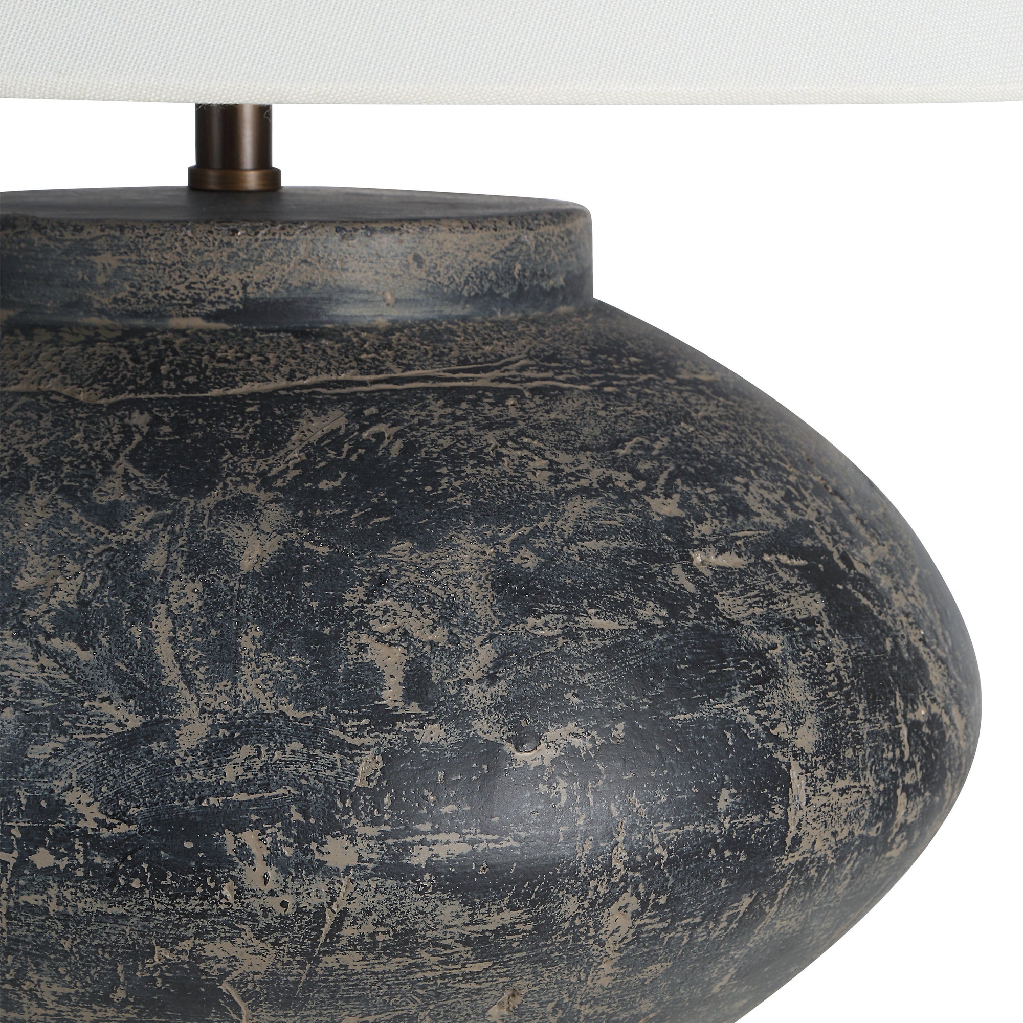 The Patina table lamp adds vintage-inspired charm to any room. Finished in distressed charcoal and beige, its ceramic base evokes a sense of effortless, timeworn beauty. Complemented by dark antique bronze details and a soft ivory linen shade, it casts a warm, inviting glow, while the dimmable rotary switch allows users to tailor the light to suit any mood or space.