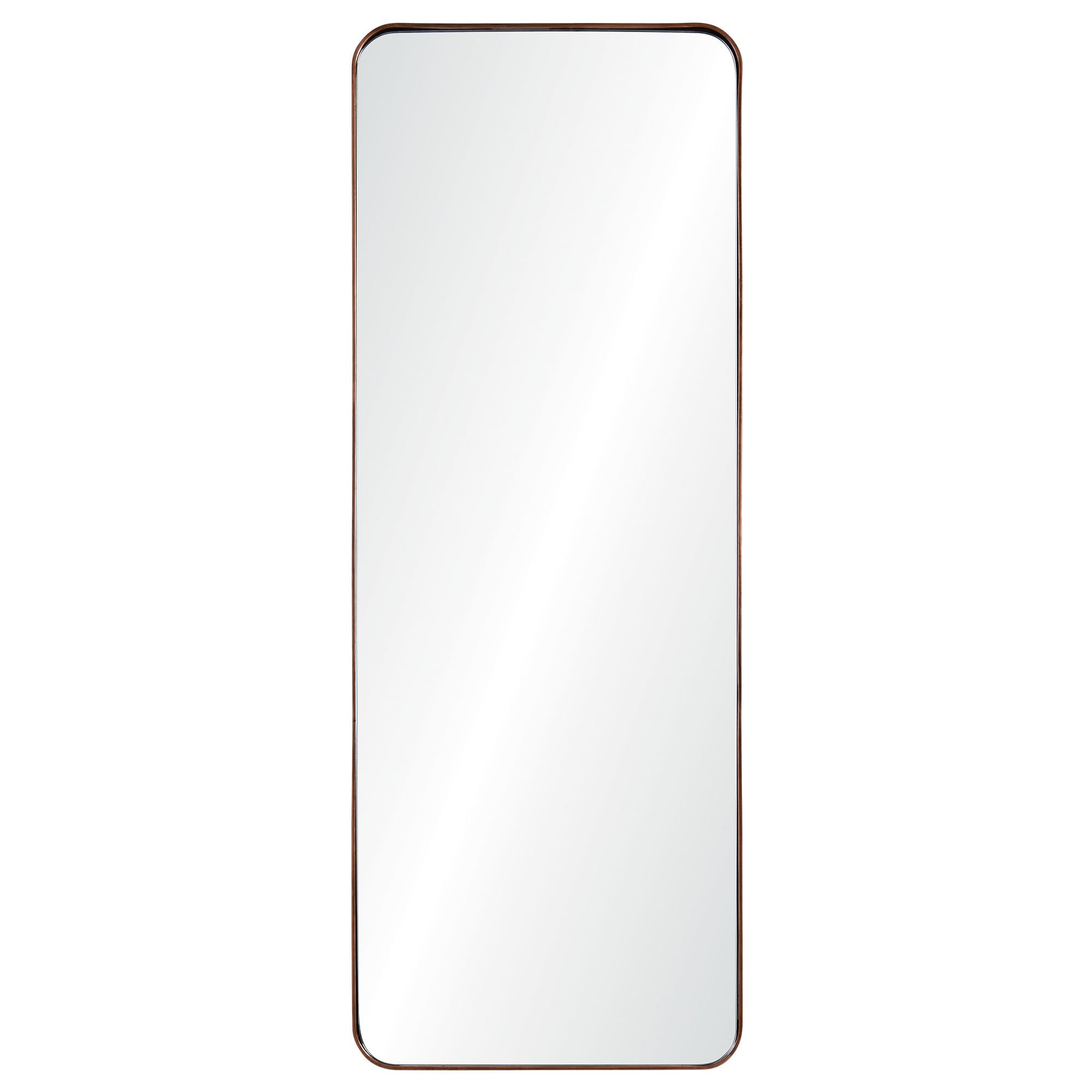 The low profile of this rectangular wall mirror serves as a stunning addition to interior walls in every room. The slightly inset looking glass is surrounded by a bronze metal frame for a touch of metallic minimalism. Gently rounded corners add a delicate curve to each edge, while the long rectangular format can be hung horizontally or vertically for a full-length view.