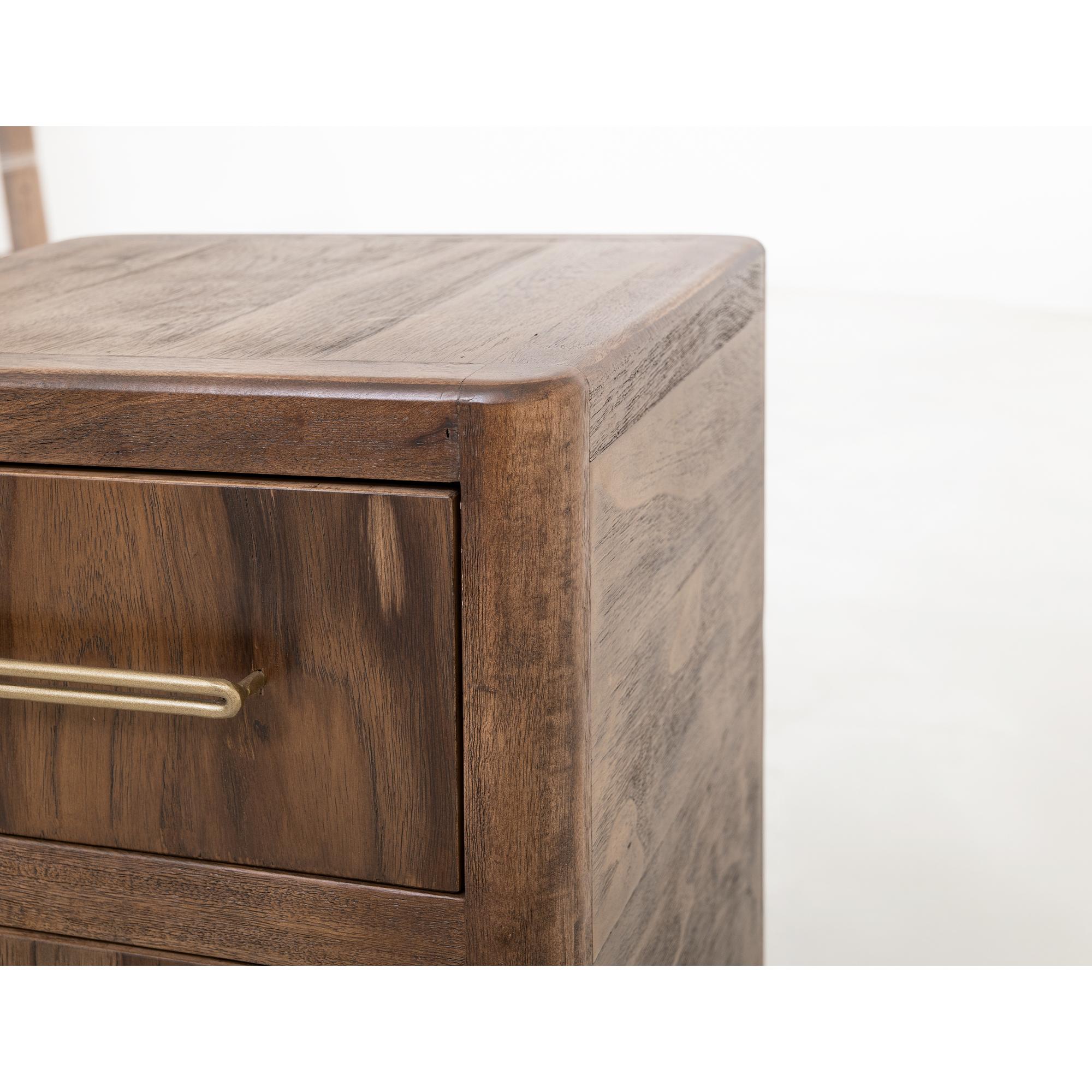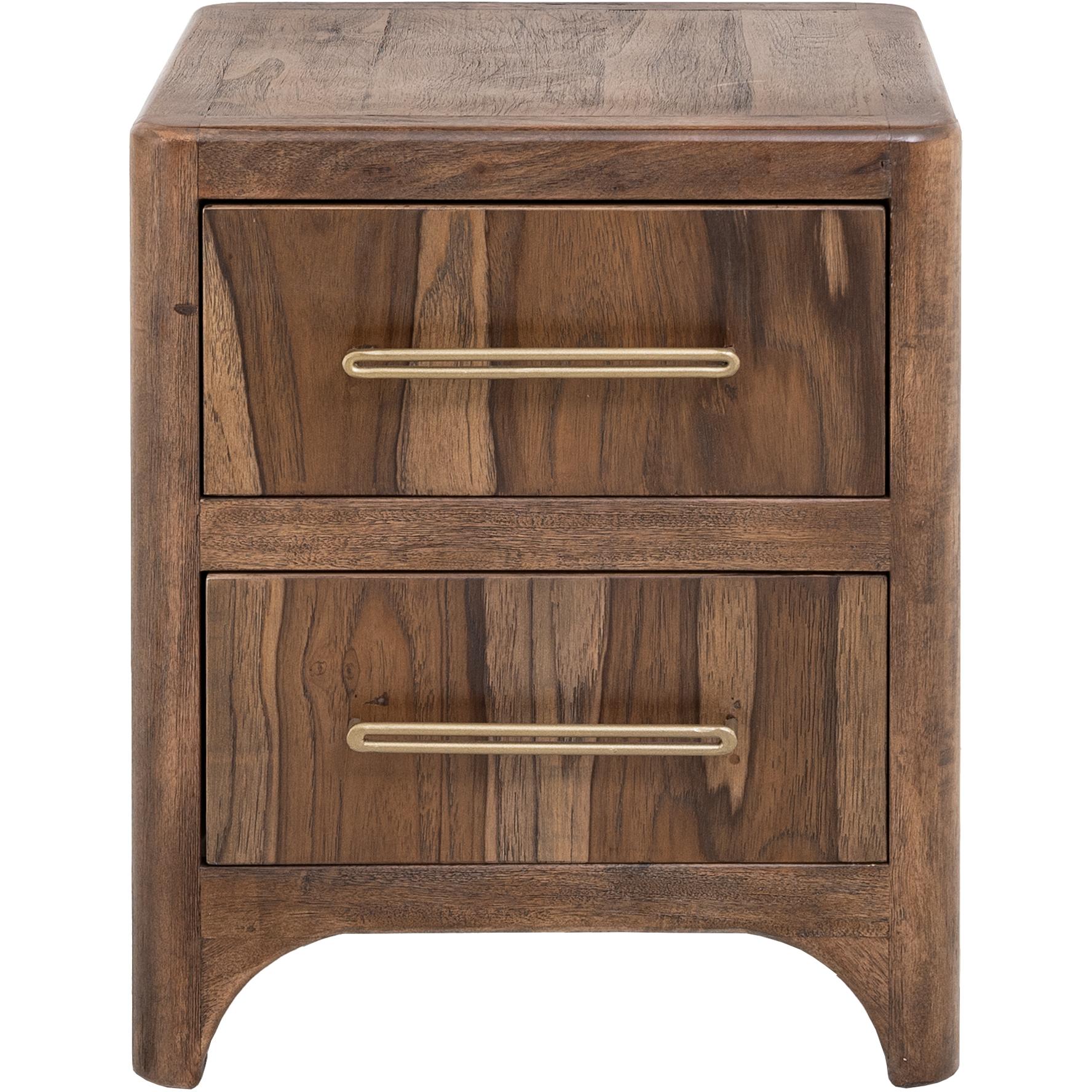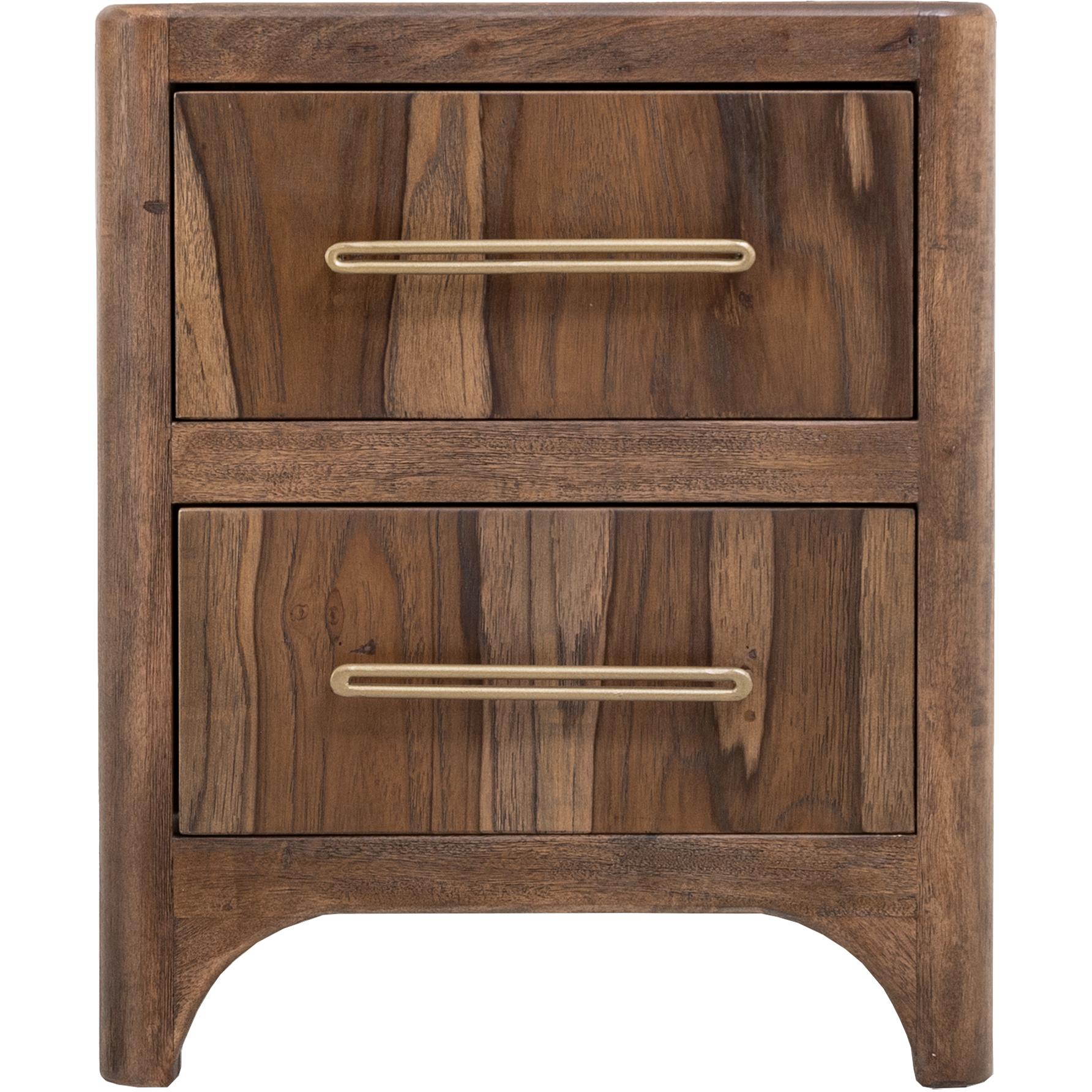 Transform your space with this modern bedroom set. Crafted from engineered teak and sustainable mango wood, this collection combines lasting durability with natural beauty. The rich brown multi-step lacquer finish adds warmth and depth to the furniture. The Praga Nightstand has two spacious drawers for ample storage. The aged golden handles add a touch of sophistication, while its short, sturdy legs provide balance and stability, making it a versatile addition to any space.