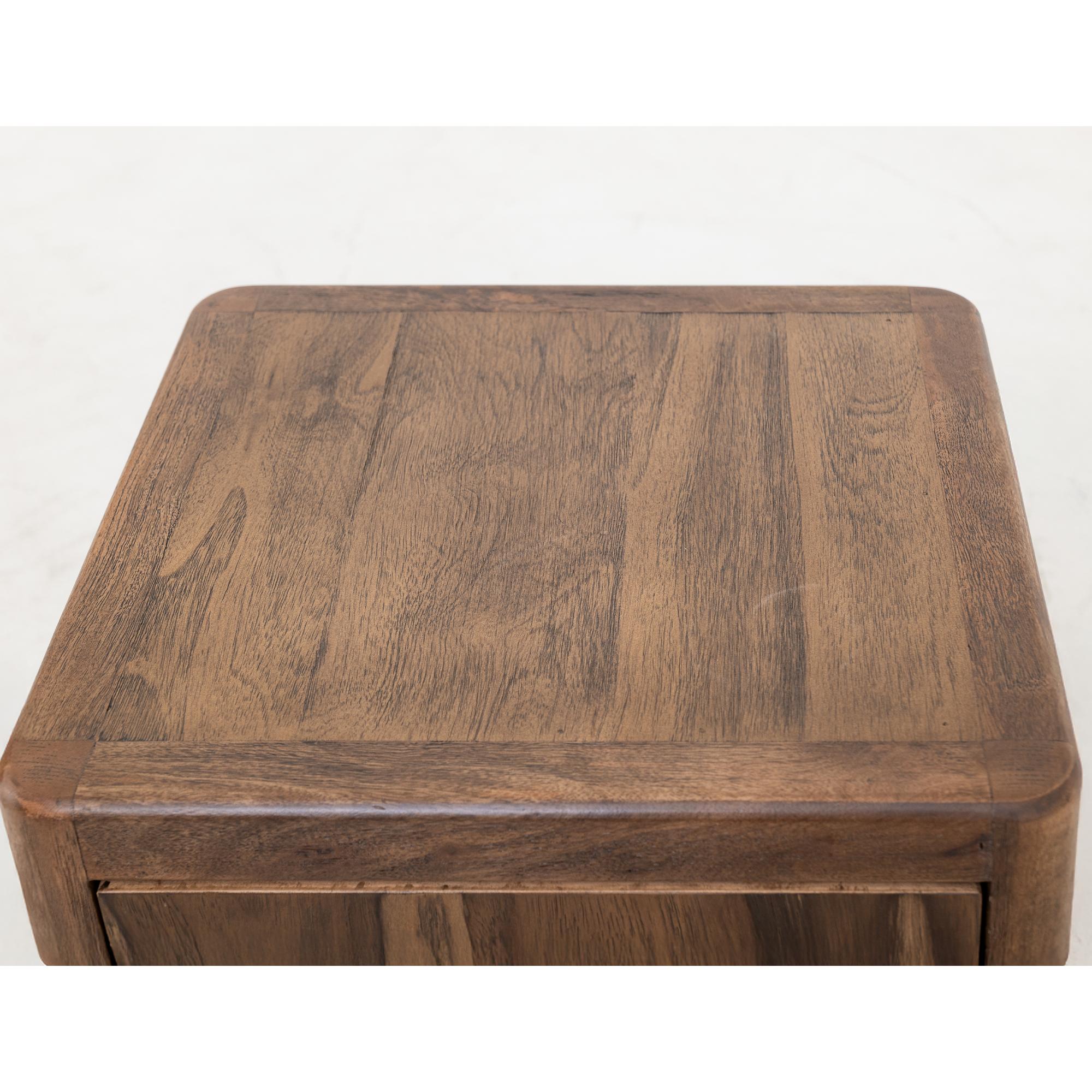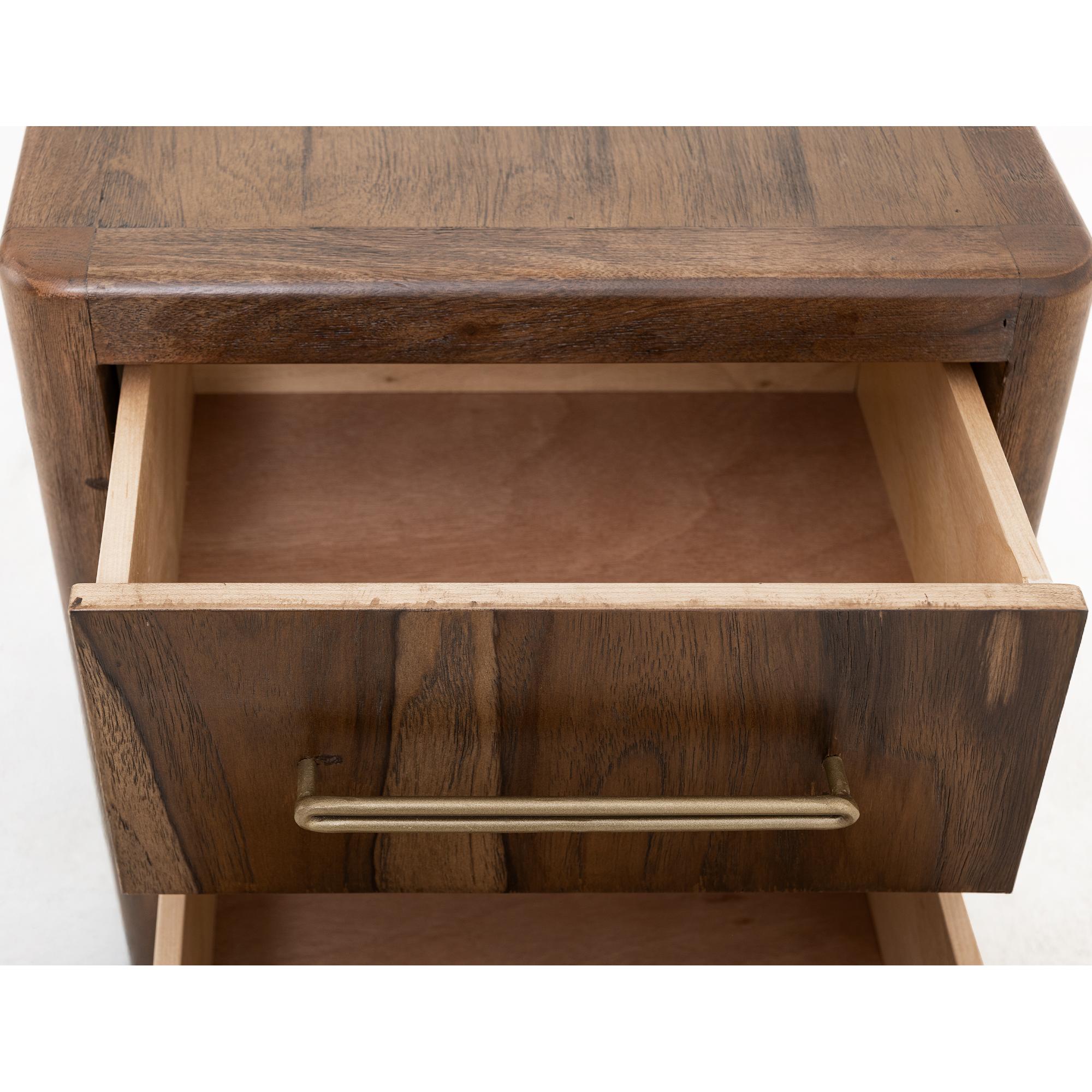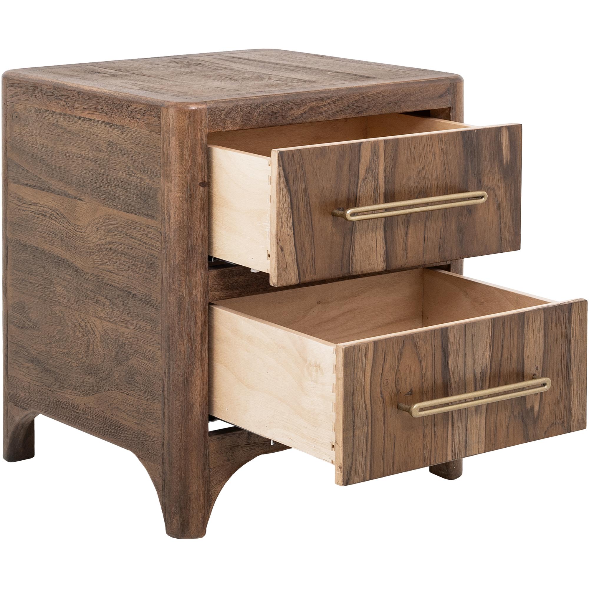 Transform your space with this modern bedroom set. Crafted from engineered teak and sustainable mango wood, this collection combines lasting durability with natural beauty. The rich brown multi-step lacquer finish adds warmth and depth to the furniture. The Praga Nightstand has two spacious drawers for ample storage. The aged golden handles add a touch of sophistication, while its short, sturdy legs provide balance and stability, making it a versatile addition to any space.