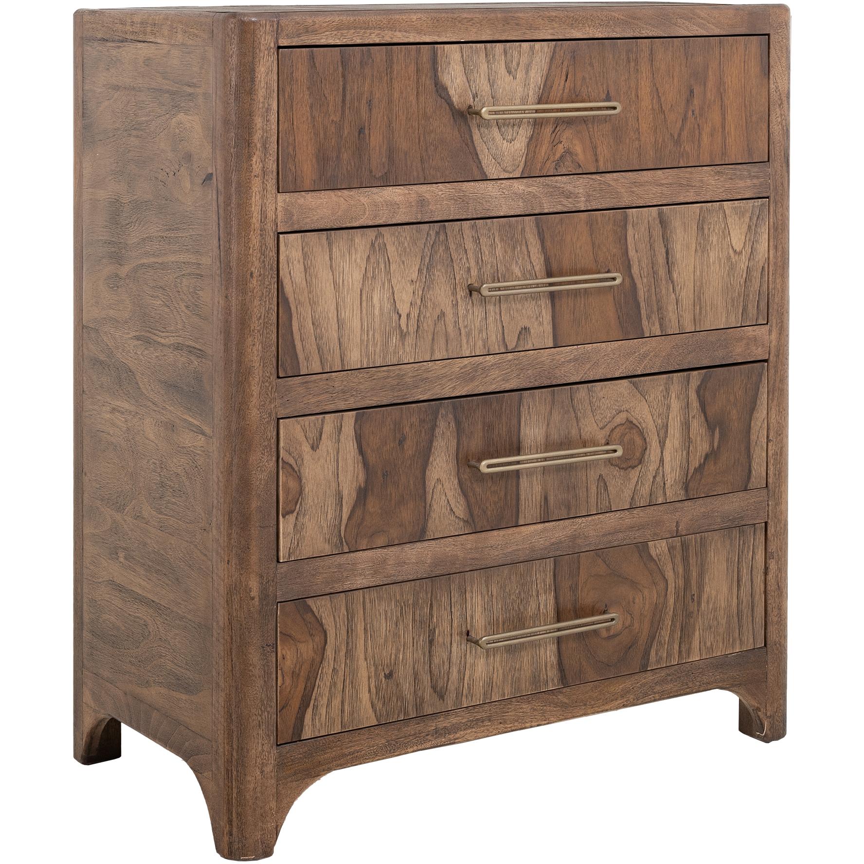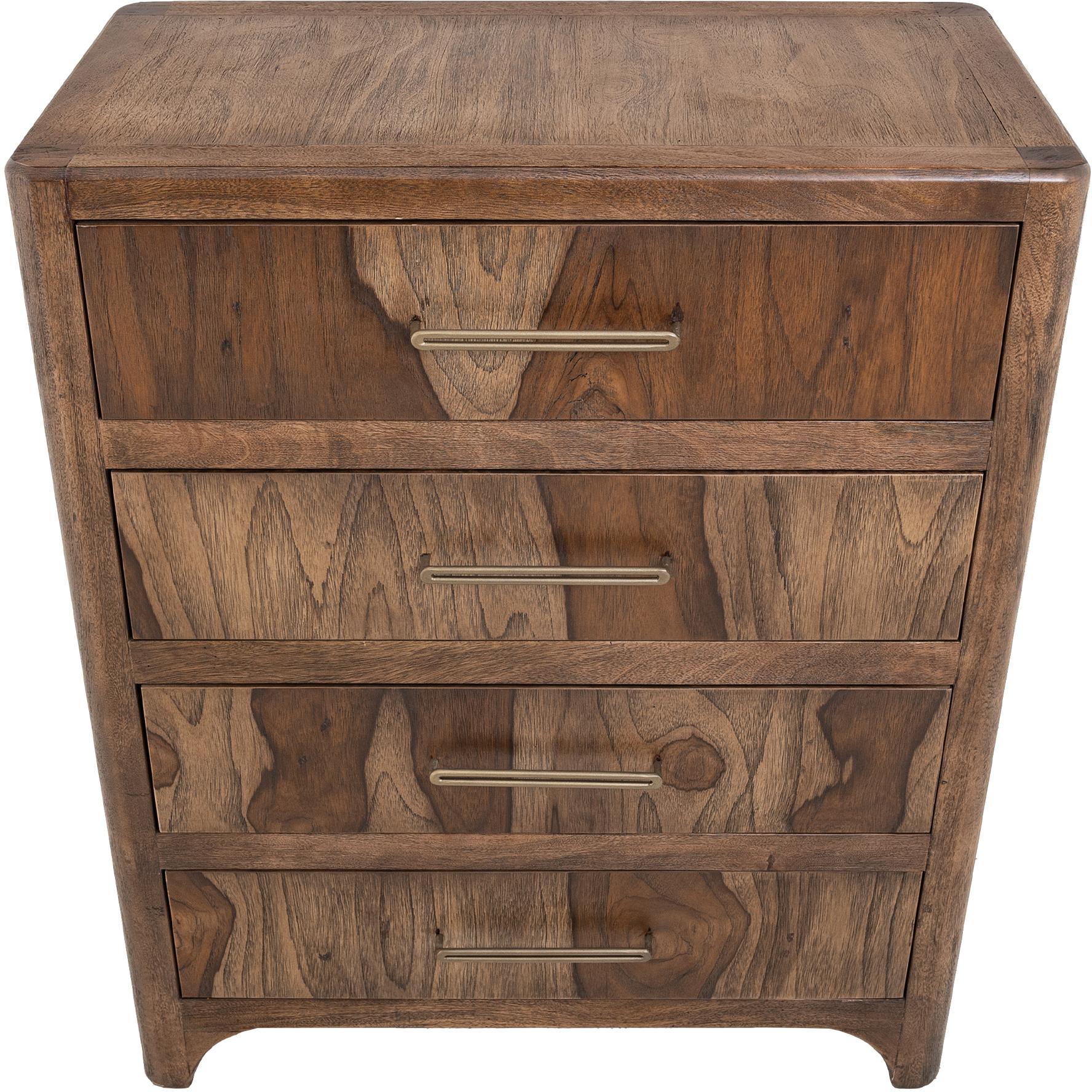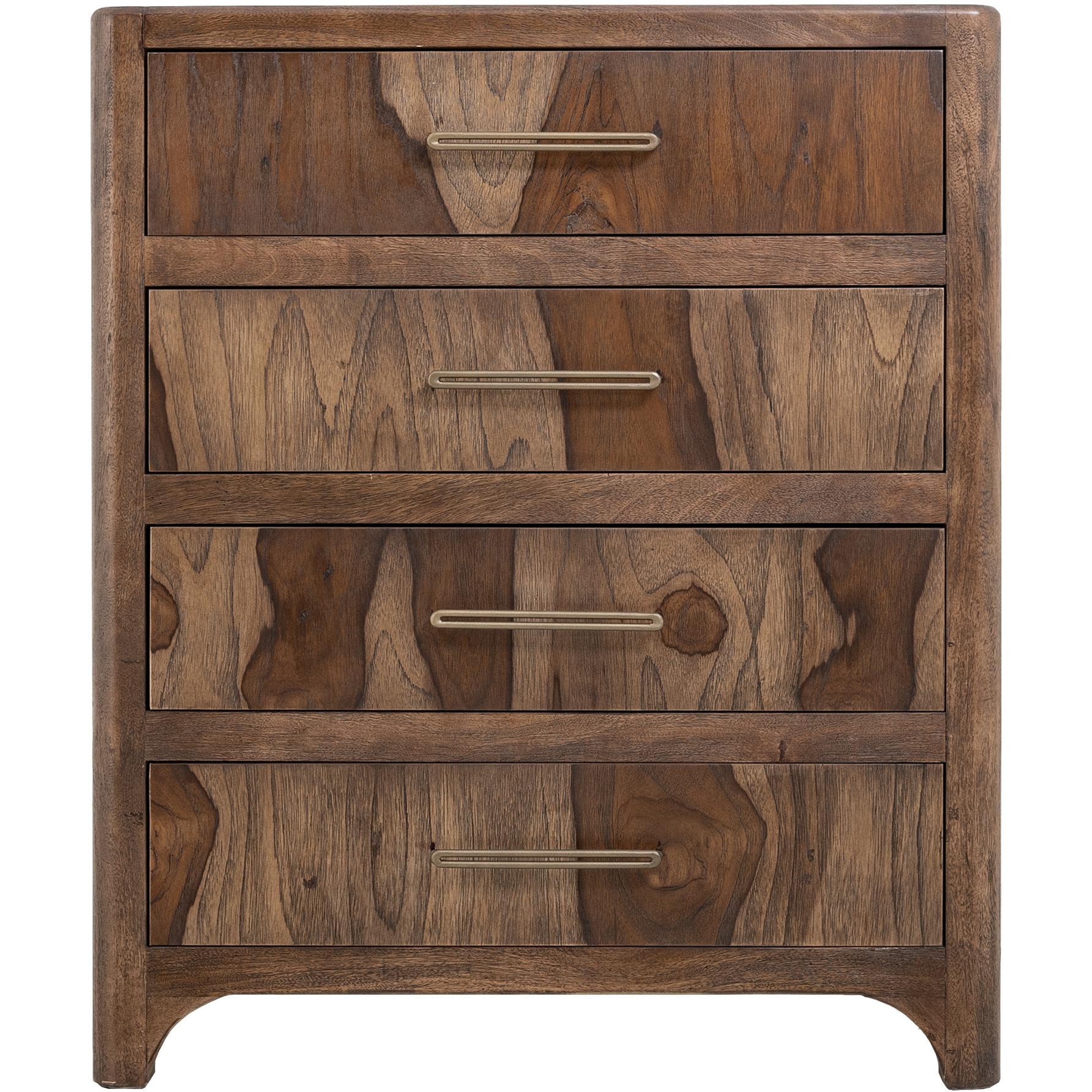 Transform your space with this modern bedroom set. Crafted from engineered teak and sustainable mango wood, this collection combines lasting durability with natural beauty. The rich brown multi-step lacquer finish adds warmth and depth to the furniture. The Praga chest has four spacious drawers for ample storage. The aged golden handles add a touch of sophistication, while its short, sturdy legs provide balance and stability, making it a versatile addition to any space.