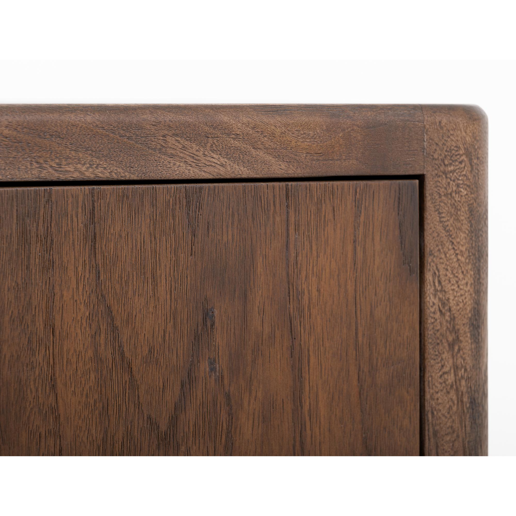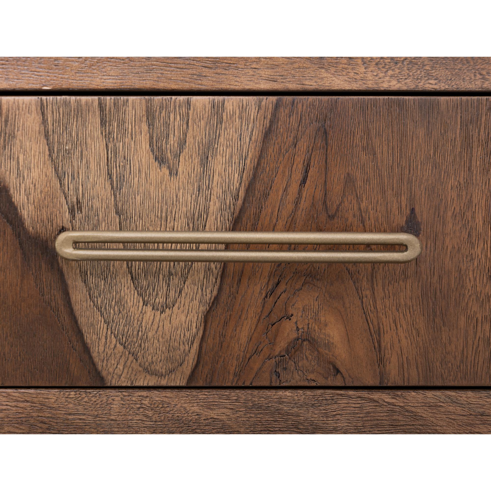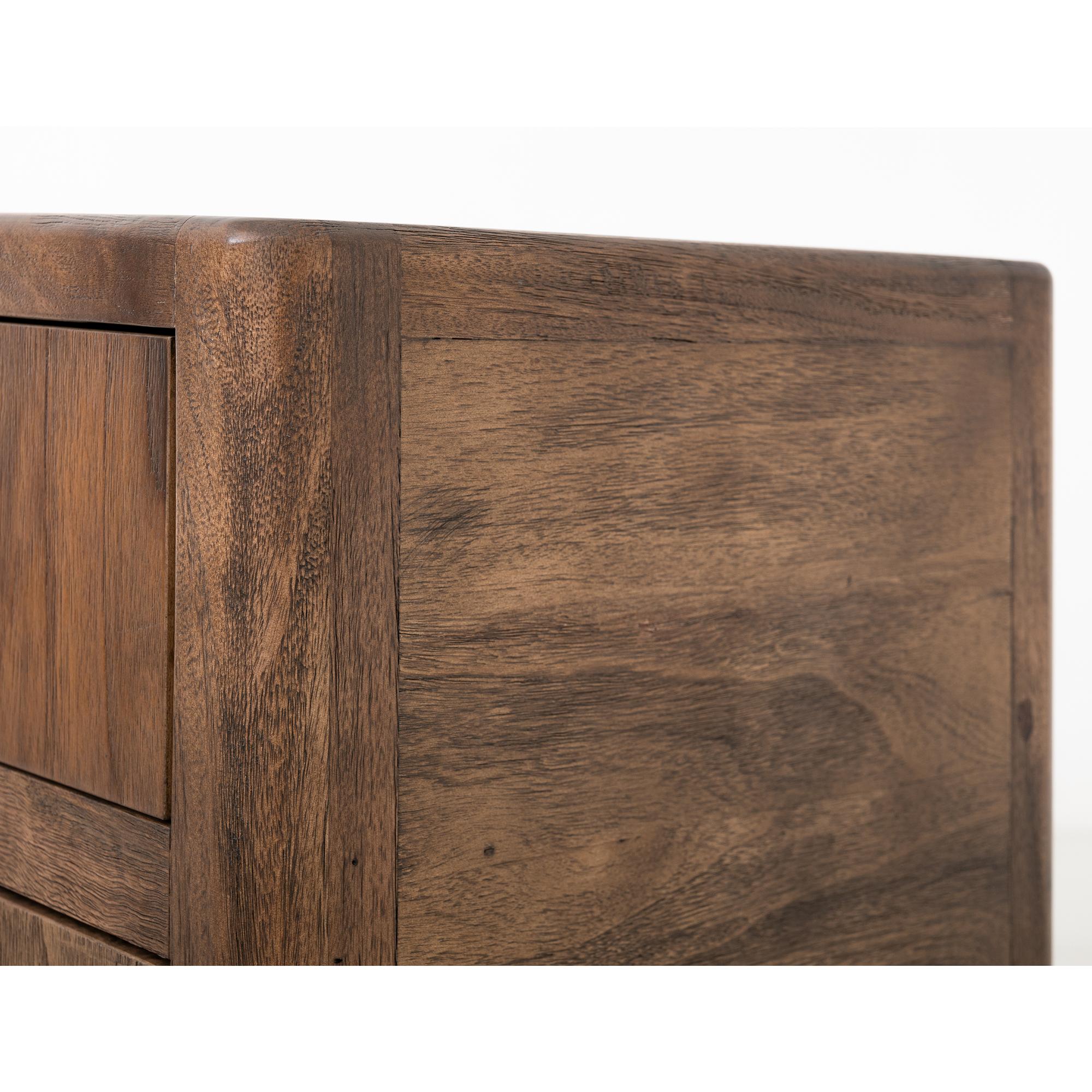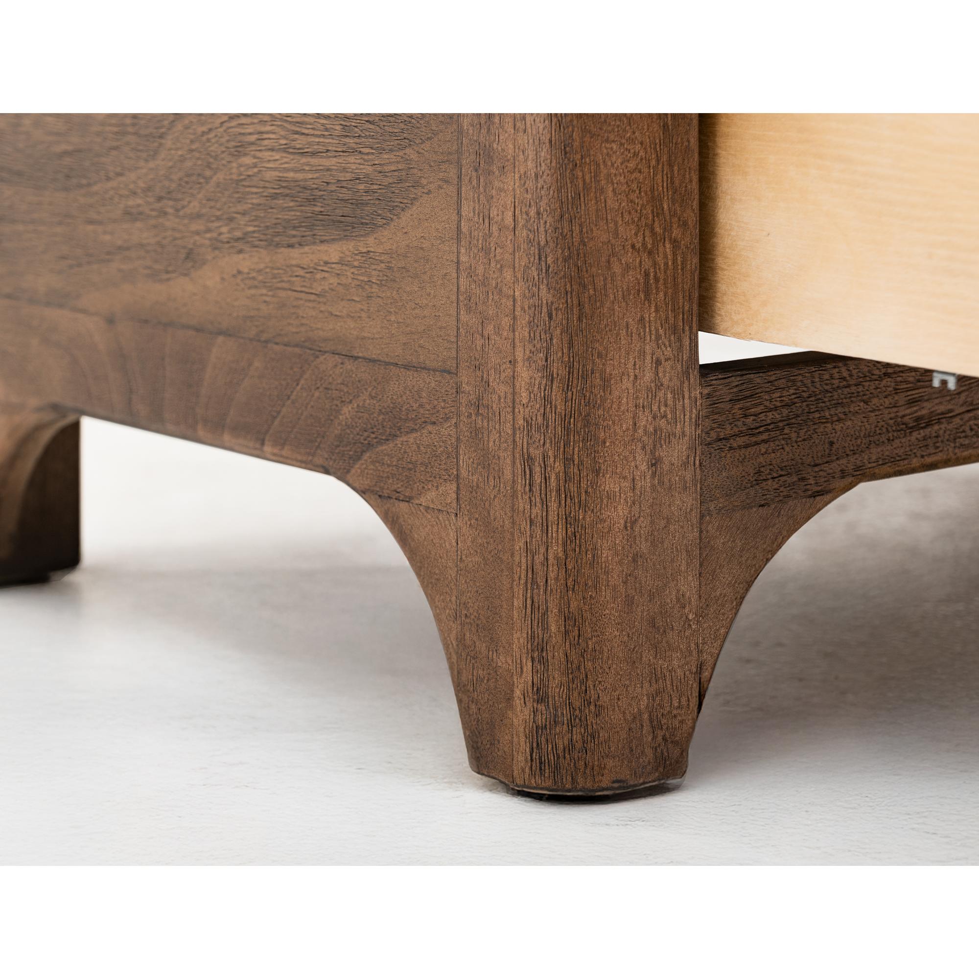Transform your space with this modern bedroom set. Crafted from engineered teak and sustainable mango wood, this collection combines lasting durability with natural beauty. The rich brown multi-step lacquer finish adds warmth and depth to the furniture. The Praga chest has four spacious drawers for ample storage. The aged golden handles add a touch of sophistication, while its short, sturdy legs provide balance and stability, making it a versatile addition to any space.
