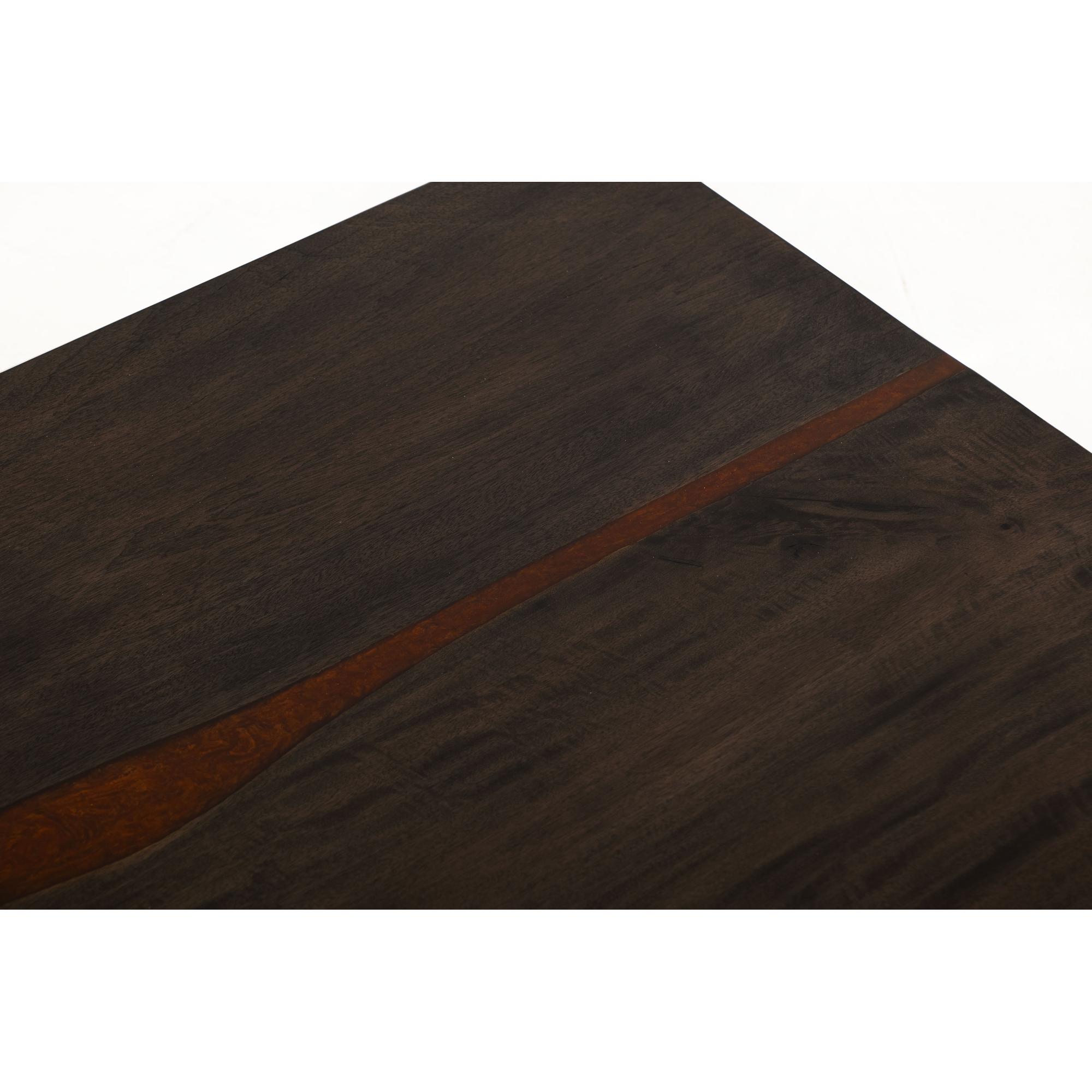- The table’s top is enhanced with epoxy resin infused with copper mineral flakes.