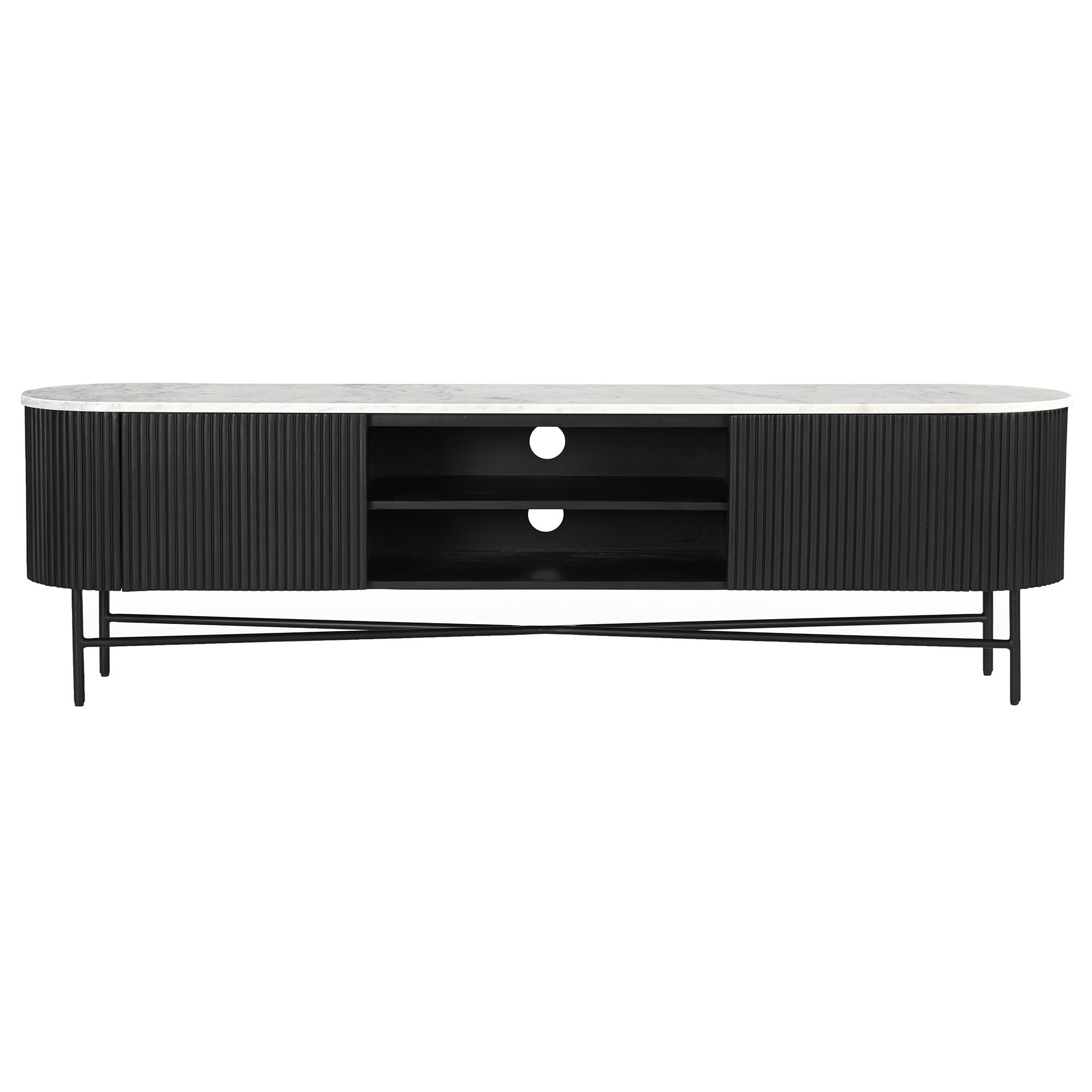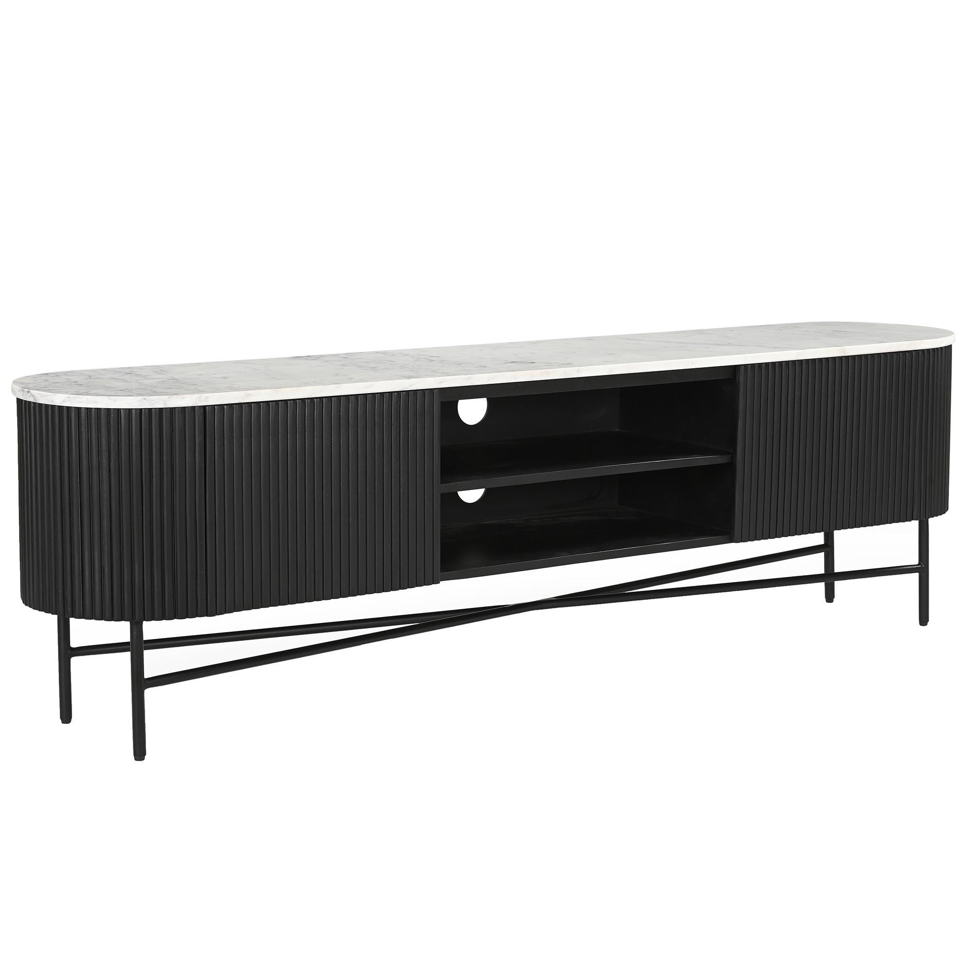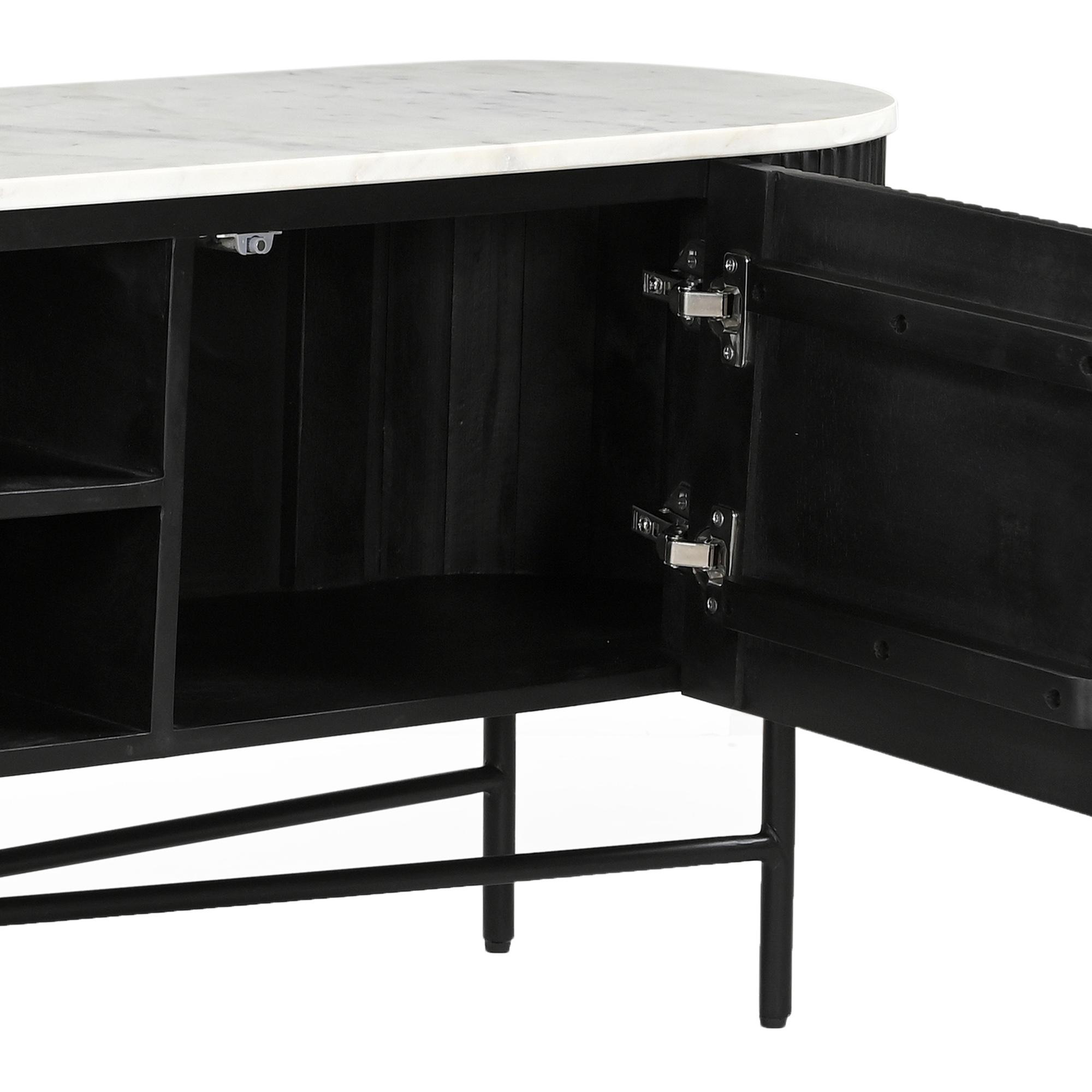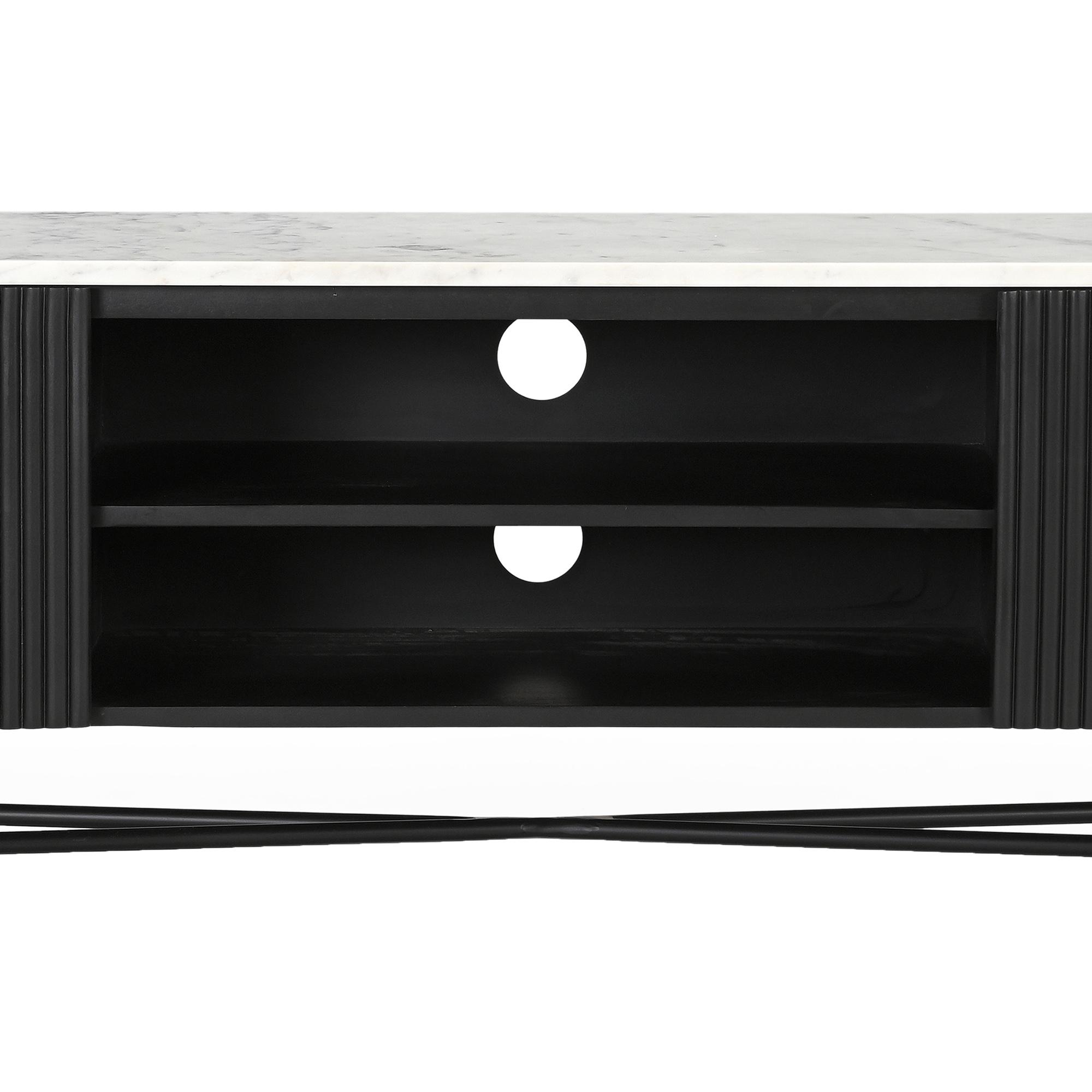 Stay organized with this stylish rustic modern media cabinet. The black-finished solid mango wood construction with white marble top and black metal base is the perfect centrepiece for any room. Keep it freestanding in a living room for storage and display, or use in a family room as a base for the tv – all the components can hideaway neatly in the open and closed storage. Holes for cable organization make it easy to keep it all clutter-free. No assembly required.