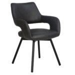 The return-swivel on this chair will kick up the design value of your space with every seated experience. Great as a dining chair, or as an accent piece in the living room or in a bedroom. The welded metal legs provide sturdy support and the contoured seat is comfortable and inviting. Faux leather upholstery is easy to wipe clean and the vintage finish adds a level of warmth. Warm, earthy tones and black metal legs combine to create the perfect modern boho-chic armchair.