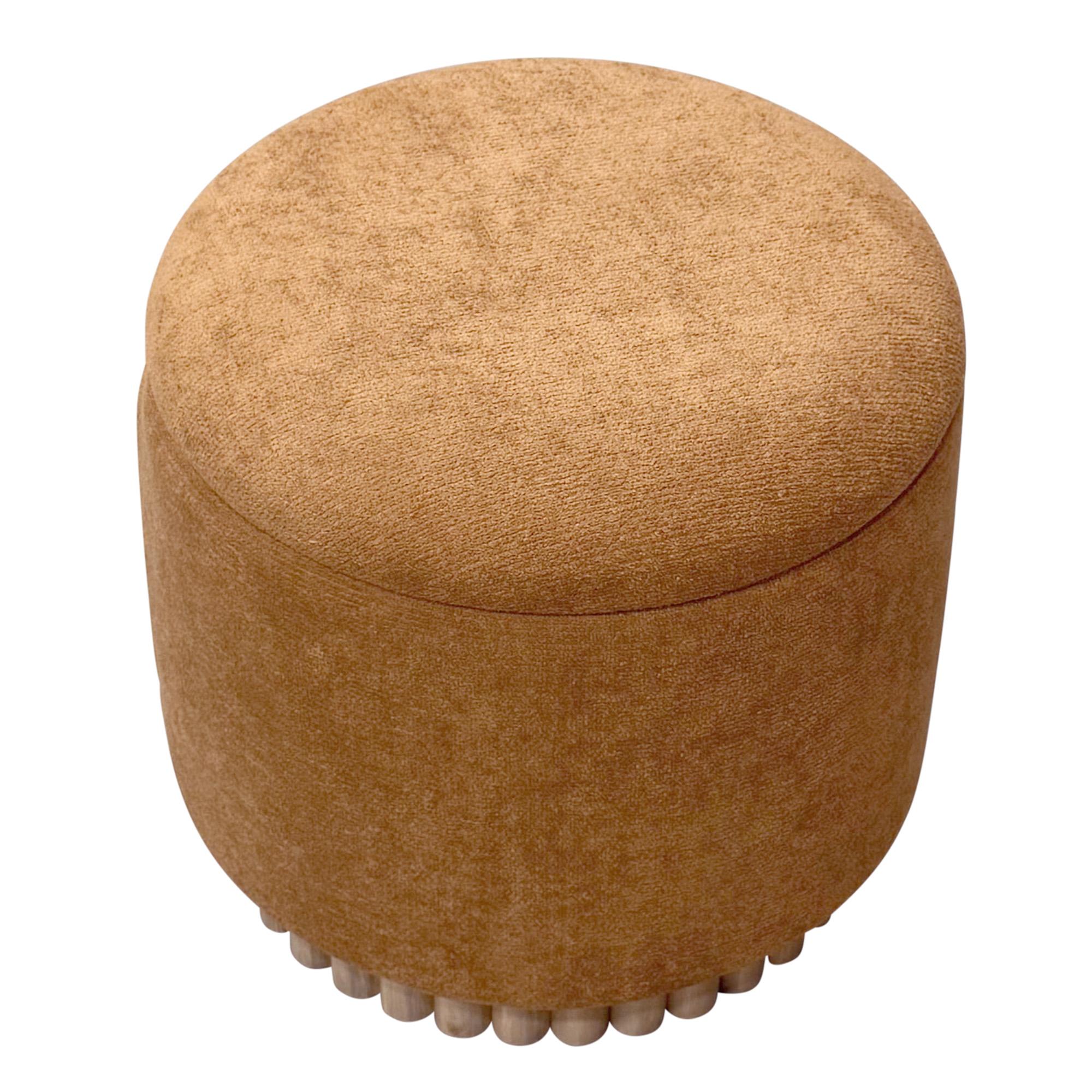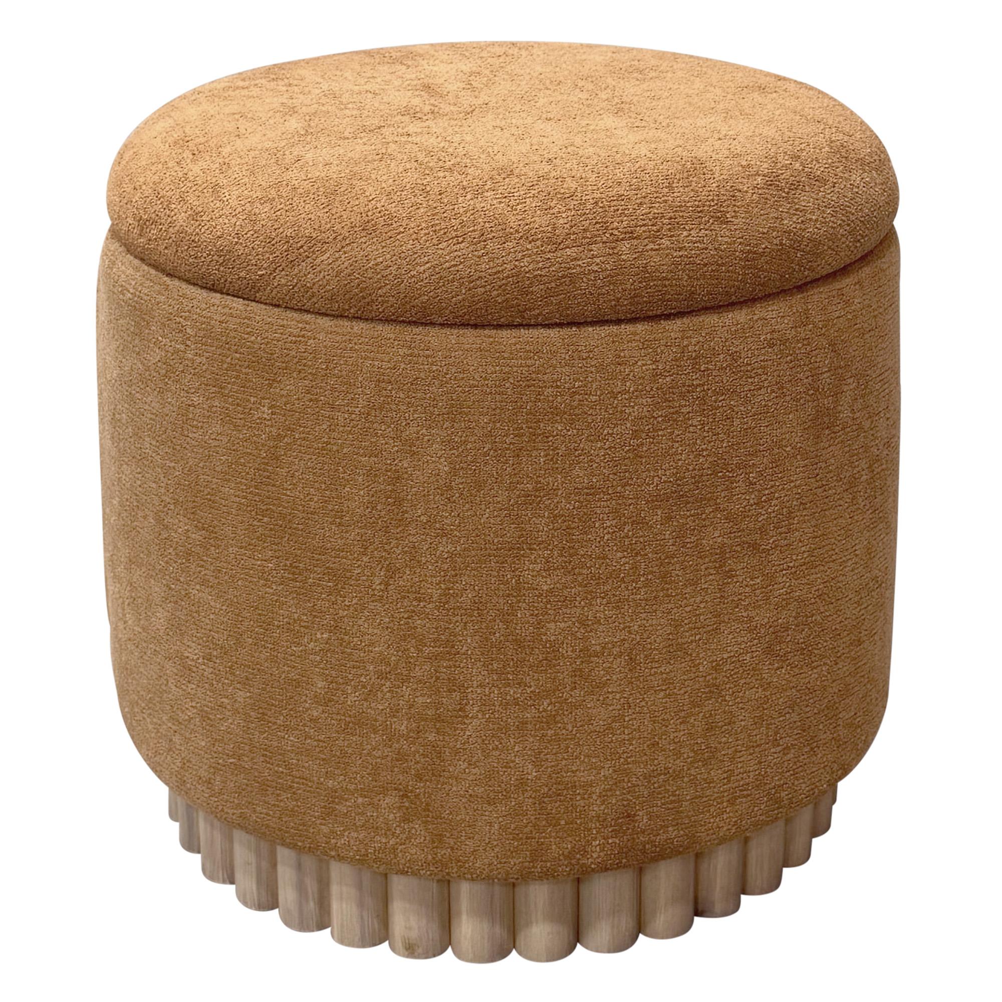 Inject a little fun into your space with this cute and cosy storage ottoman. Spacious storage compartment and a solid wood, reeded base in a natural finish. Multifunctional, can be used in any room of the house for extra seating, design or storage.