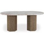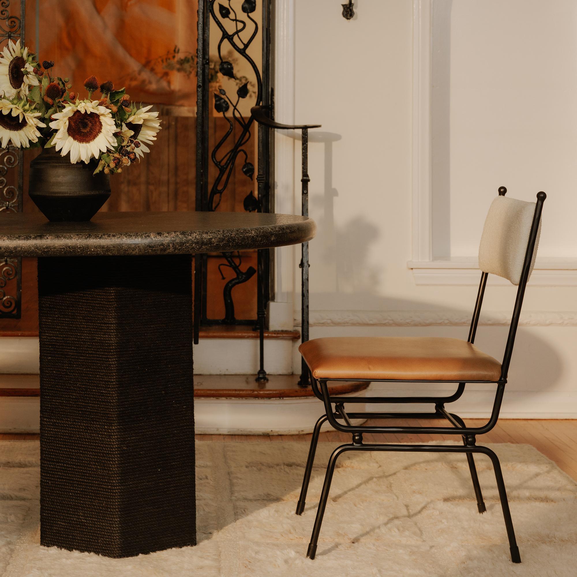 The Sartoria dining table invites conversation and collaboration. Its thick bullnose edge top is crafted with black granite, a reinterpretation of an older material into a weathered finish with a European feel. A jute-wrapped pedestal base complements the vibrant top for a touch of organic texture, function, and support for its smooth, inviting form.