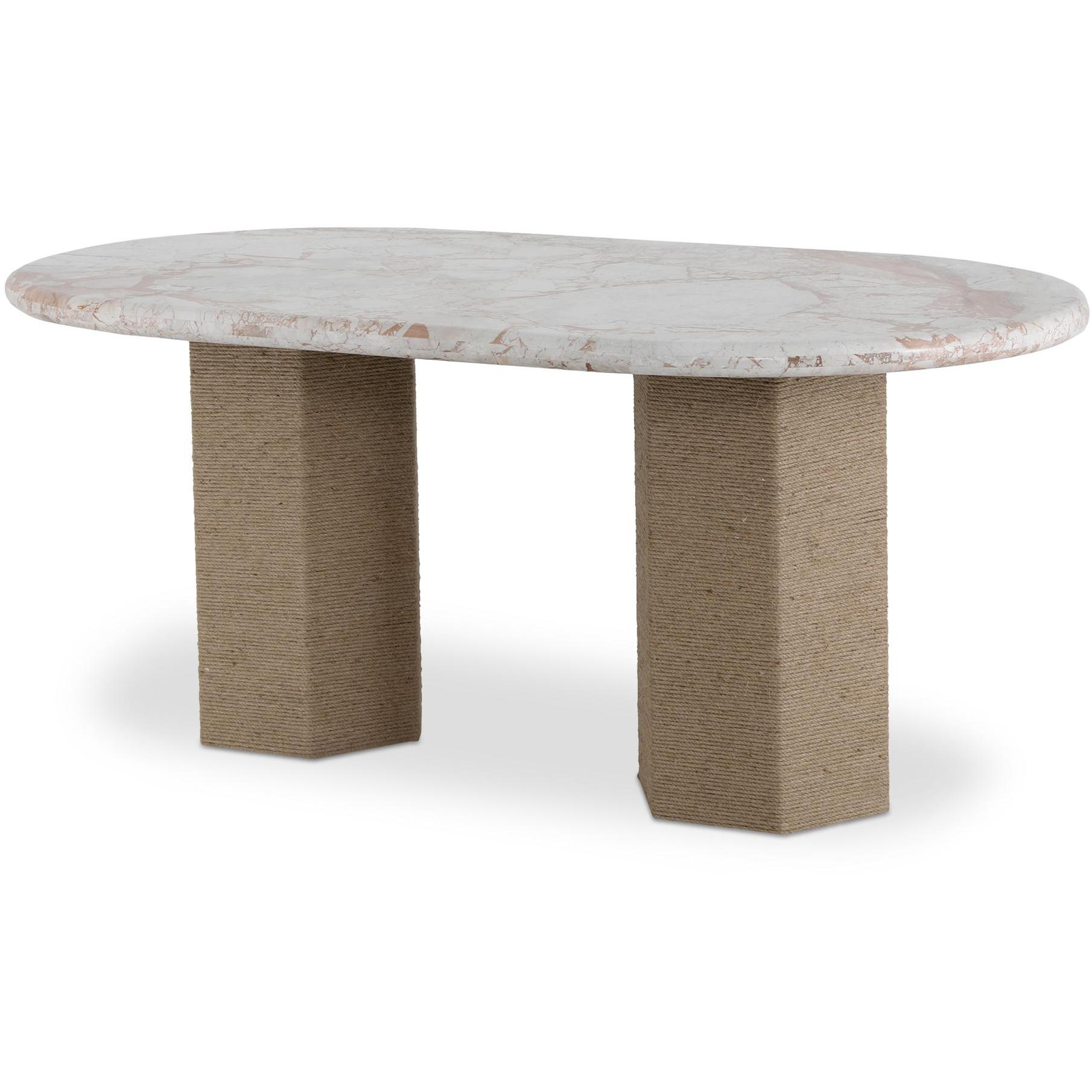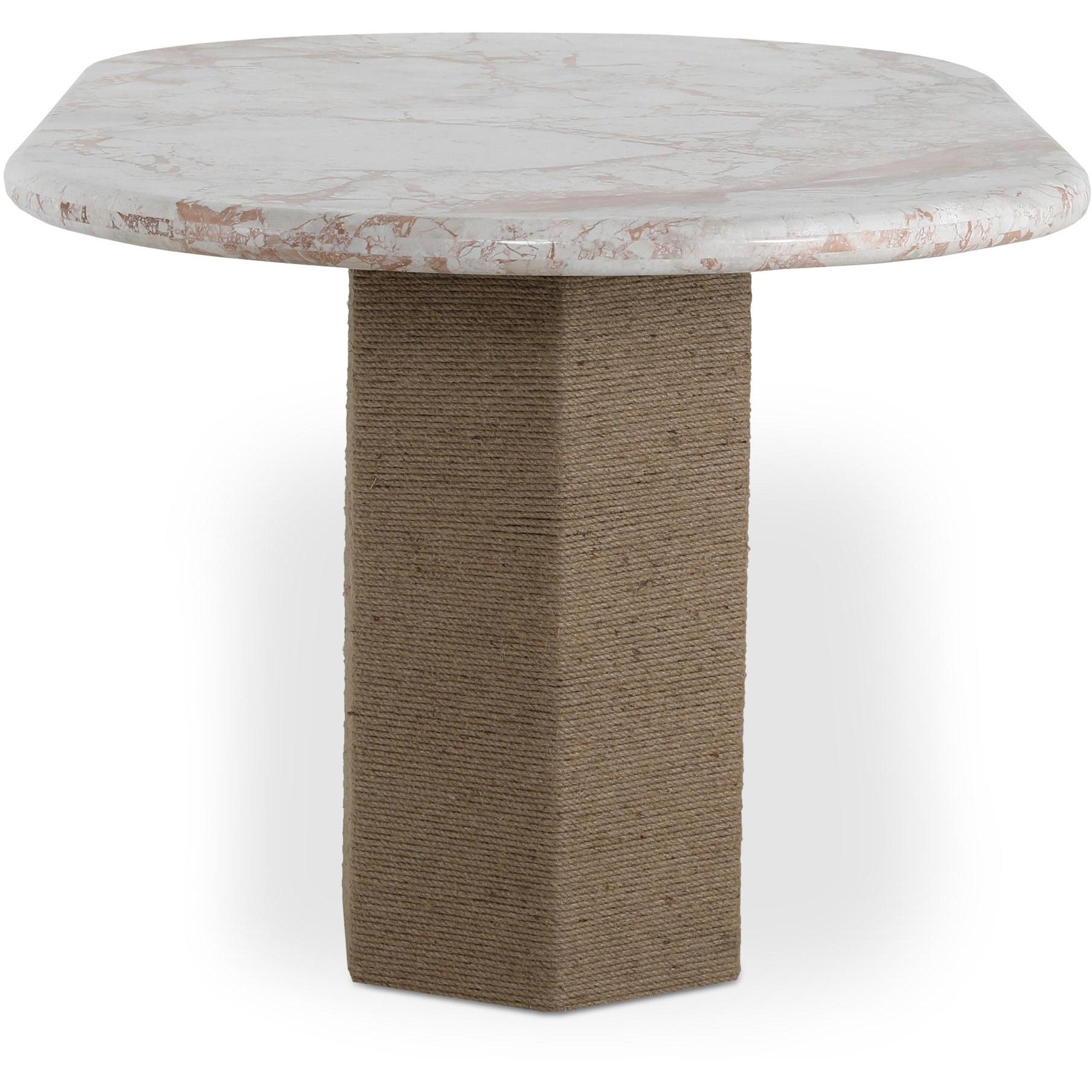 The Sartoria dining table invites conversation and collaboration. Its thick bullnose edge top is crafted with bold marble, a signature material for Gillian known for its European flair. A jute-wrapped pedestal base complements the vibrant top for a touch of organic texture, function, and support for its smooth, inviting form.
