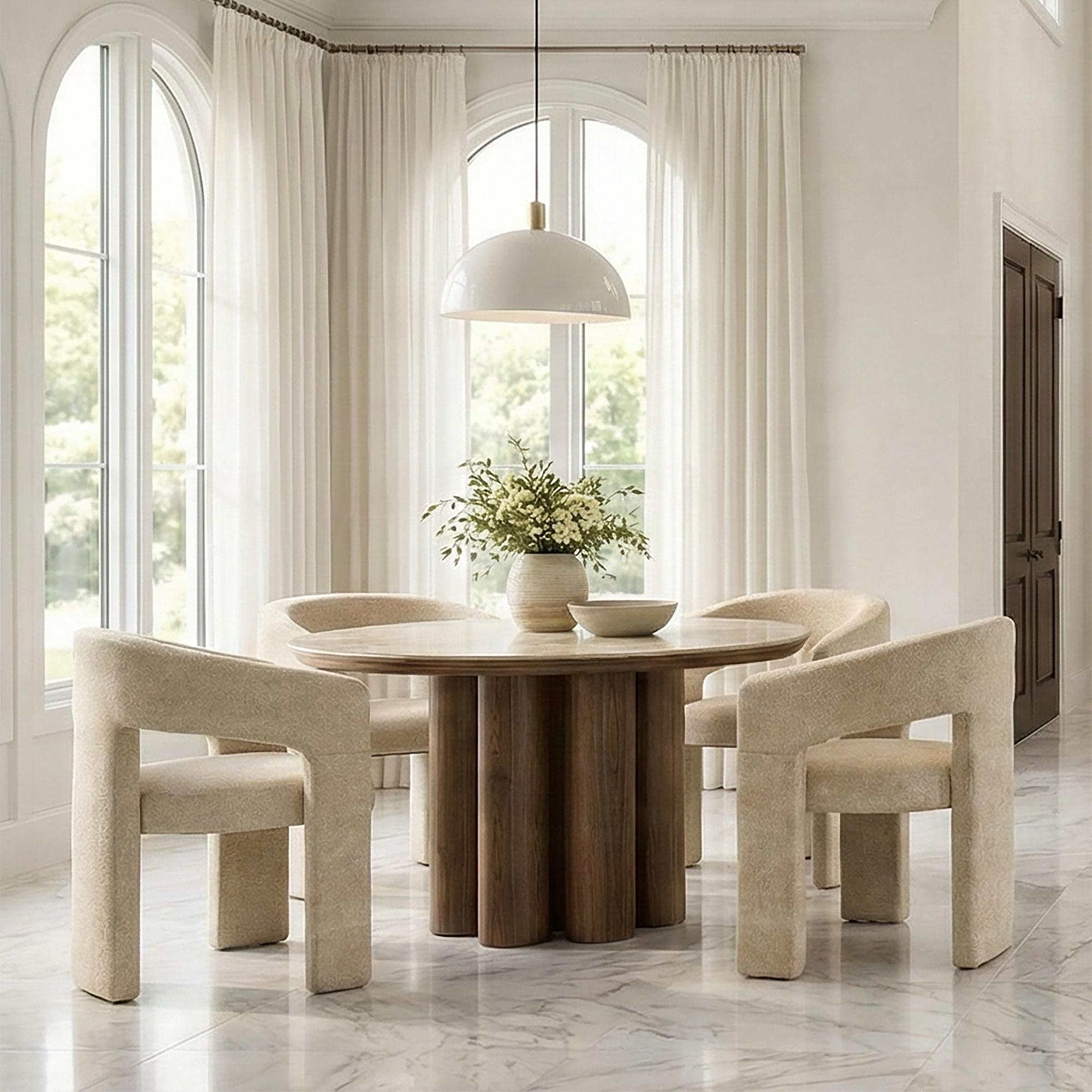 Seaton and Amara 5pc Dining Set – Walnut and Travertine Table and Beige Chairs