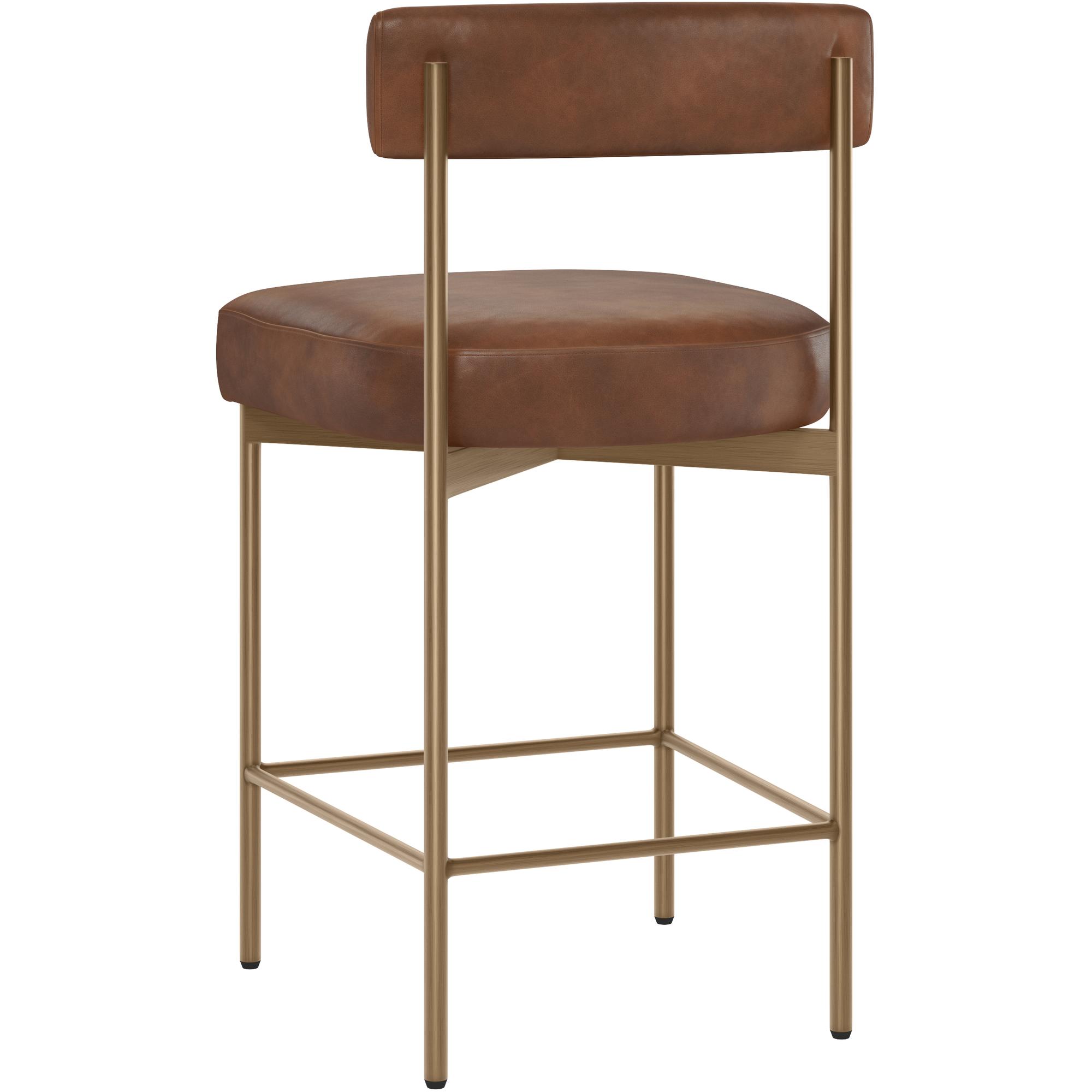 Exude modern style this open back counter stool. Stocked in bravo cognac faux leather with an antique brass steel frame.