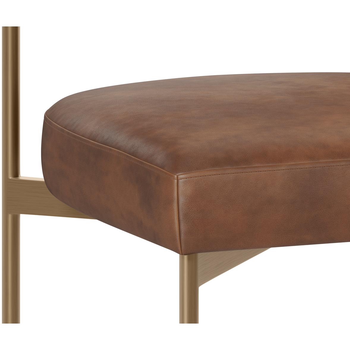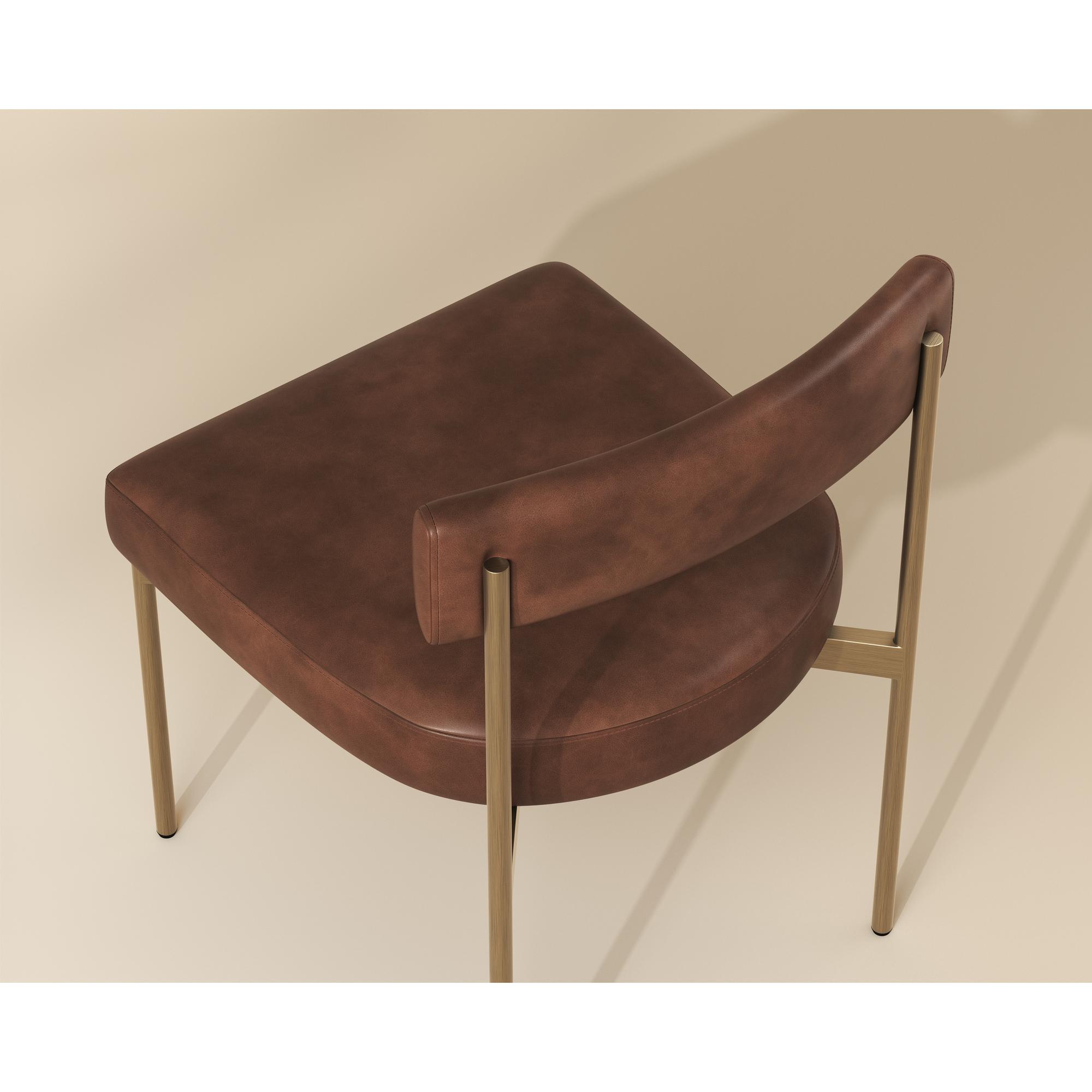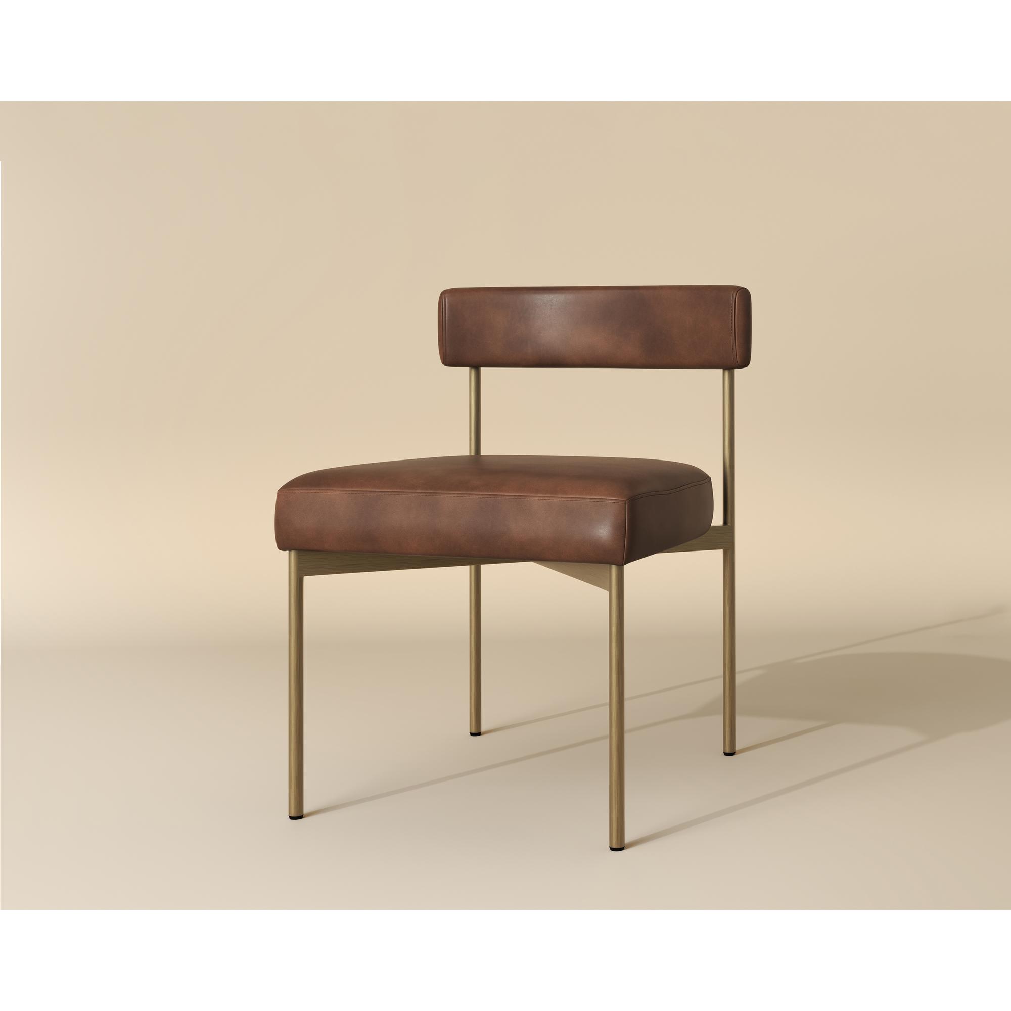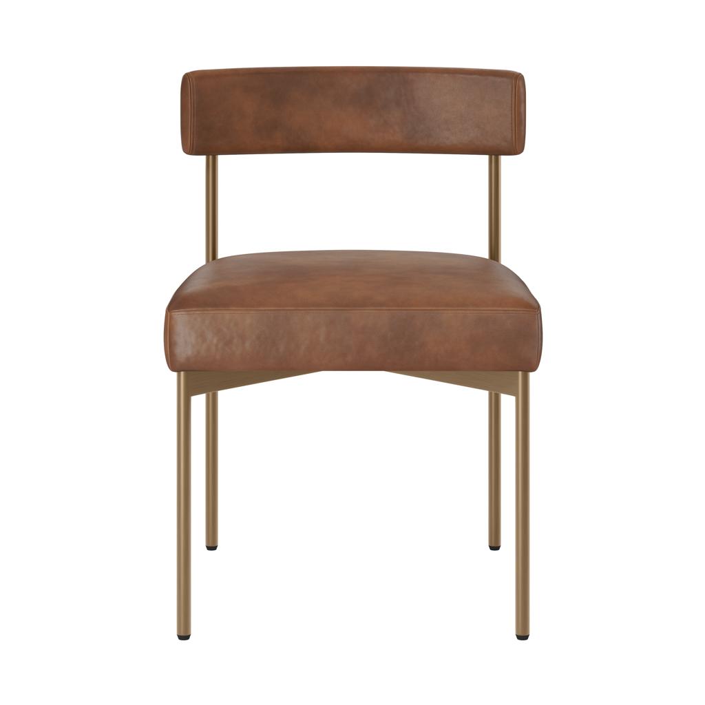 Exude modern style with this open back dining chair. Stocked in bravo cognac faux leather with an antique brass steel frame.