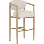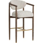A study in poise and proportion, the Sigrid Barstool is designed for gathering in ease. Its rounded dark oak frame wraps gracefully around striped, gifford script fabric upholstery. A stainless steel stretcher and feet caps complete the frame, adding a beautiful contrast against the warmth of the oak.
