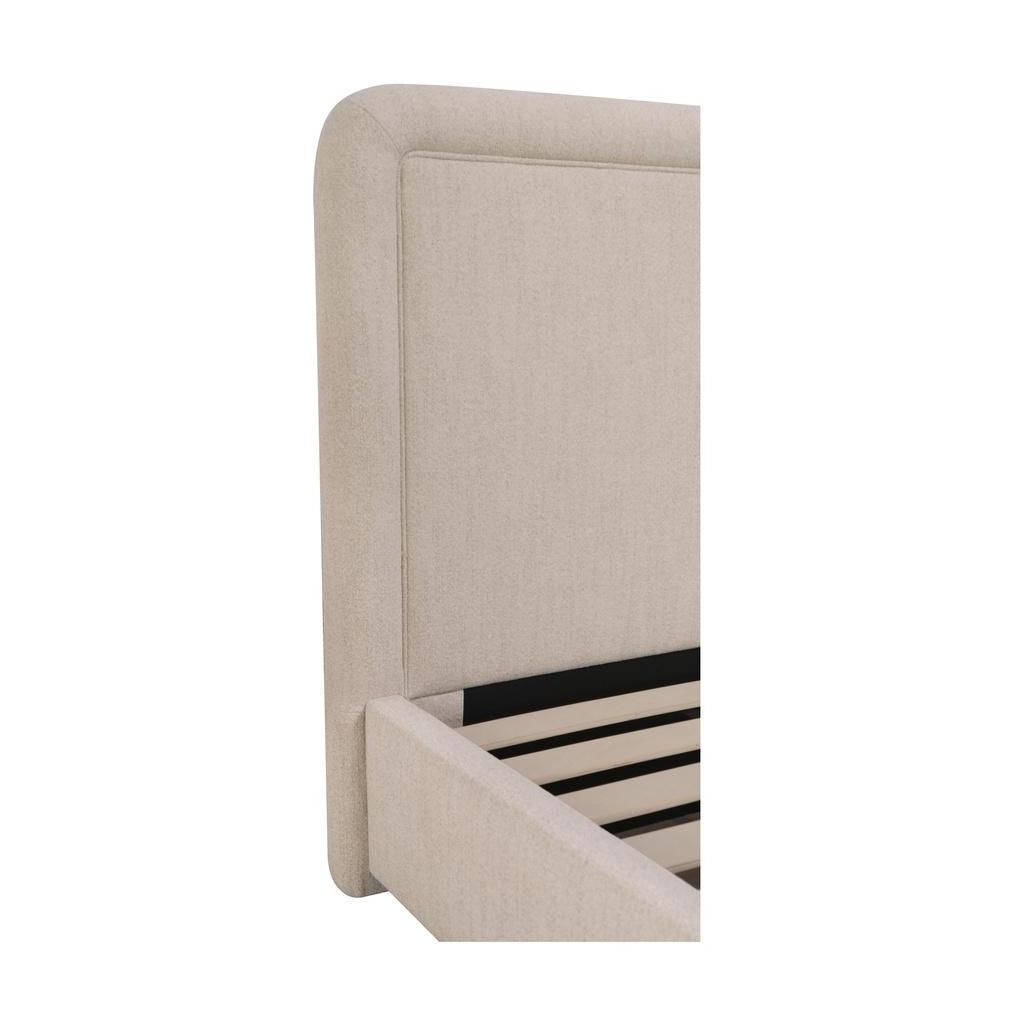 A bed with a hidden trick. The Simon Bed features a rounded silhouette with piped detailing, upholstered in flecked beige polyester for softness and durability. The full footboard pulls forward to reveal storage divided into two panels, keeping essentials organized without clutter. Built with engineered wood, solid wood, and MDF, Simon turns practical storage into part of the design story.