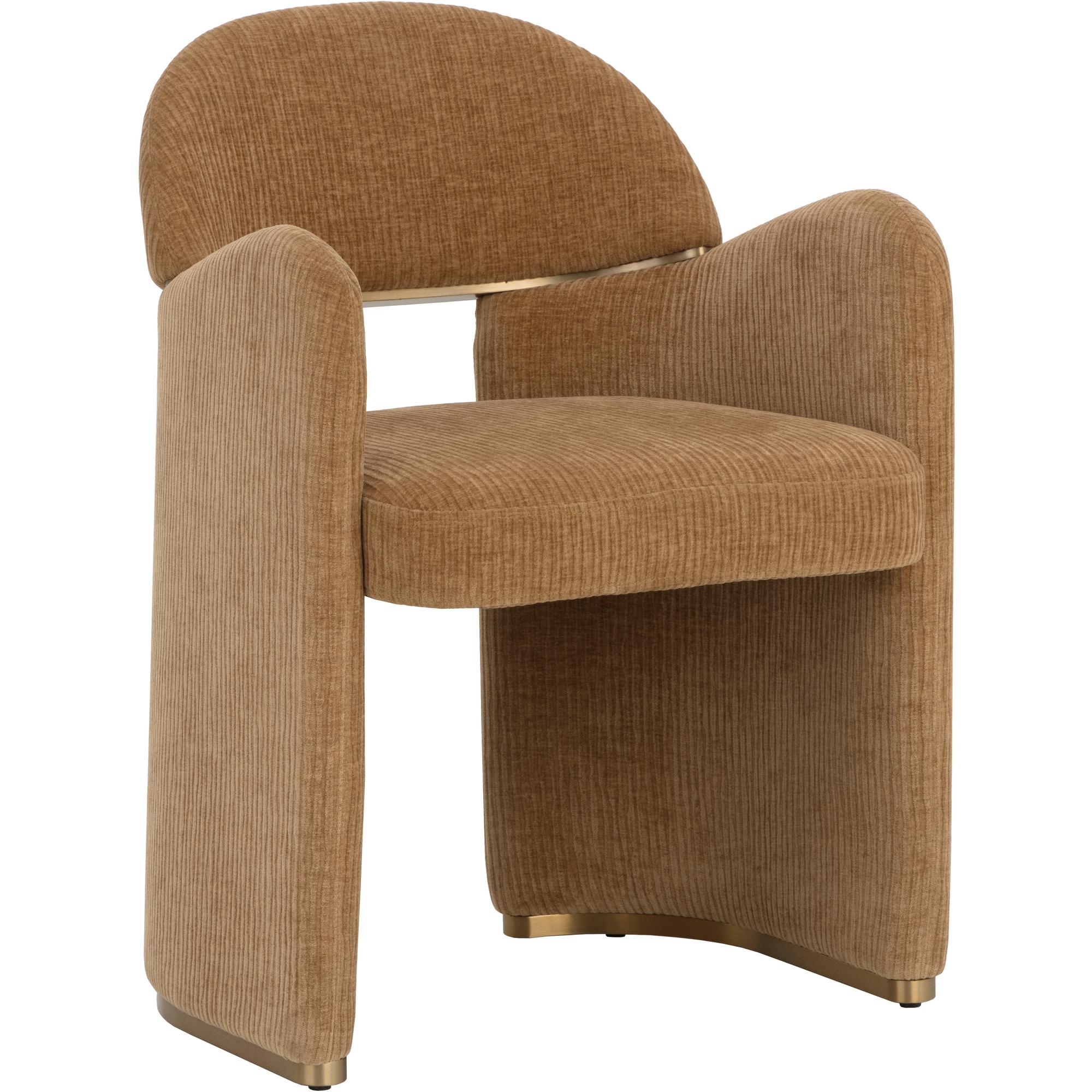 The Snowden Dining Armchair is a conversation starter. Textured opera butterscotch fabric, art deco curves, and soft angles create a unique, geometric silhouette that captivates from all sides. Gold metal inlay on the backrest and on the legs ties the modern look together.