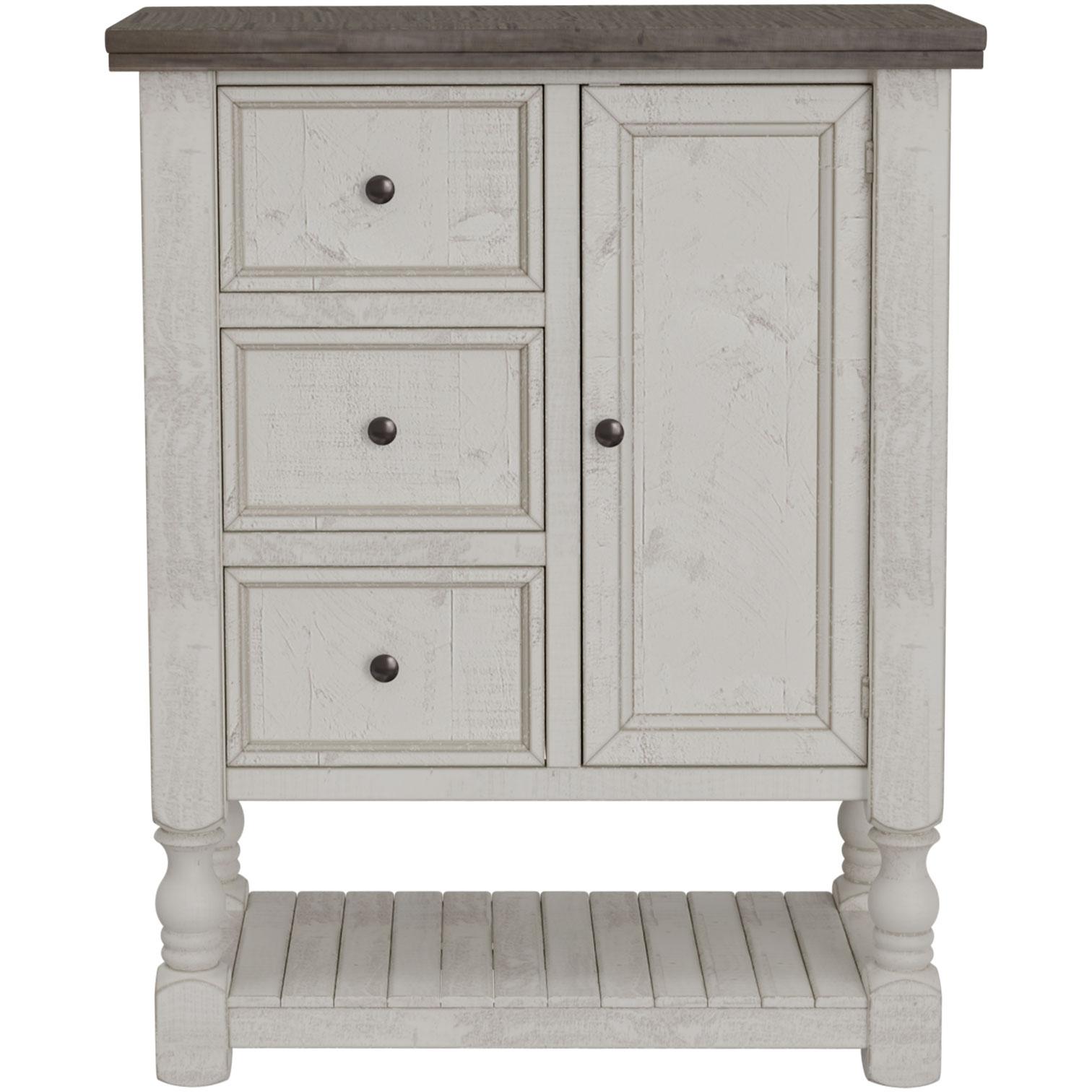 Exuding farmhouse chic with just the right touch of old-world charm, the Stone Collection is meticulously crafted from solid pine wood. The wood is lightly distressed, showcasing a white finish and complemented by weathered gray tops.