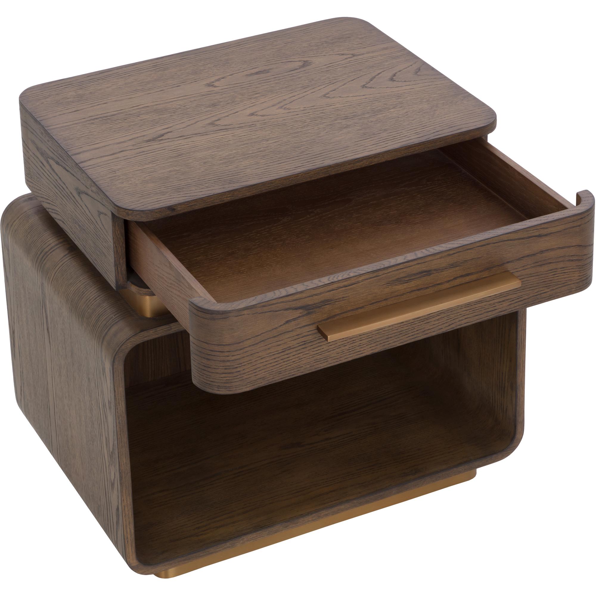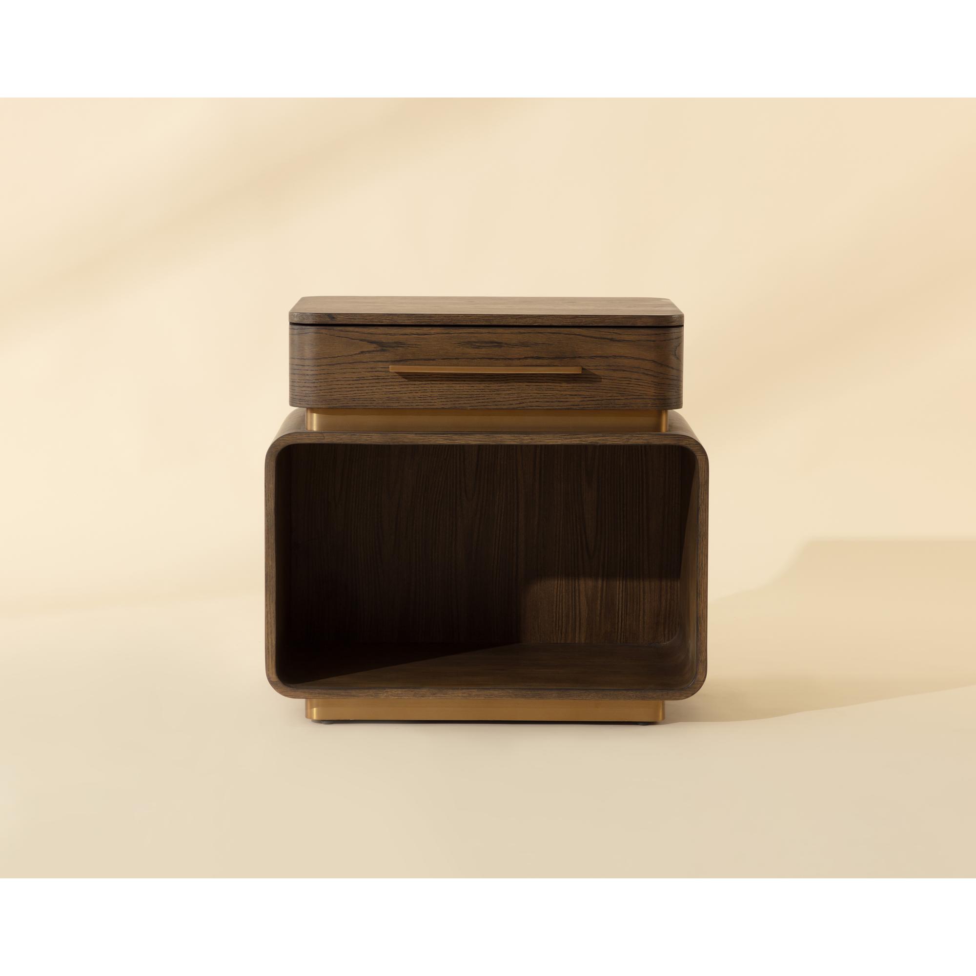 The Taro Nightstand lends an enigmatic form that reinvigorates any bedroom space. Crafted from solid oak wood with a chocolate finish, its rounded corners soften its geometric profile. A brushed gold base and matching handle introduce a warm contrast, while the open shelf and soft-close drawer offer both display and discreet storage.
