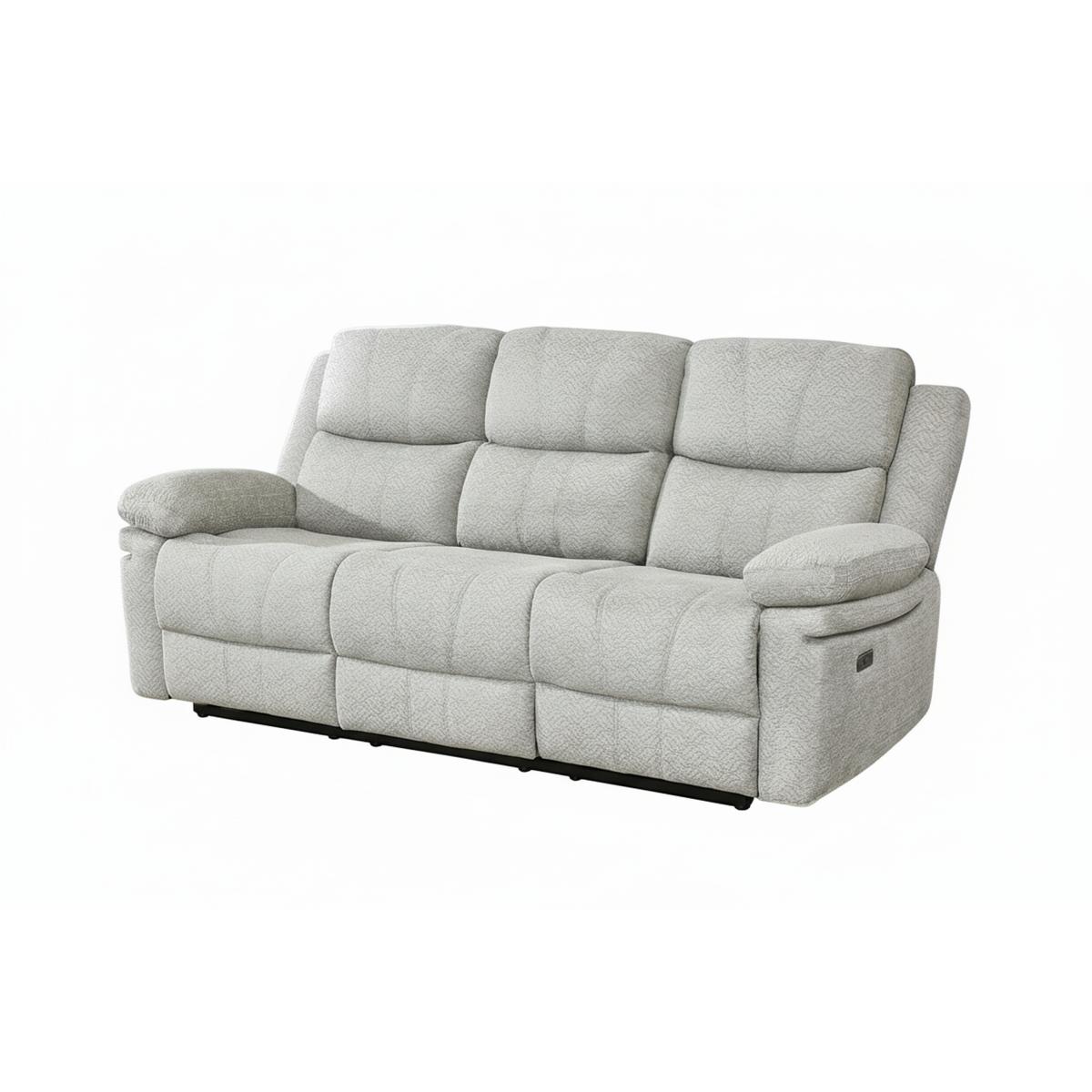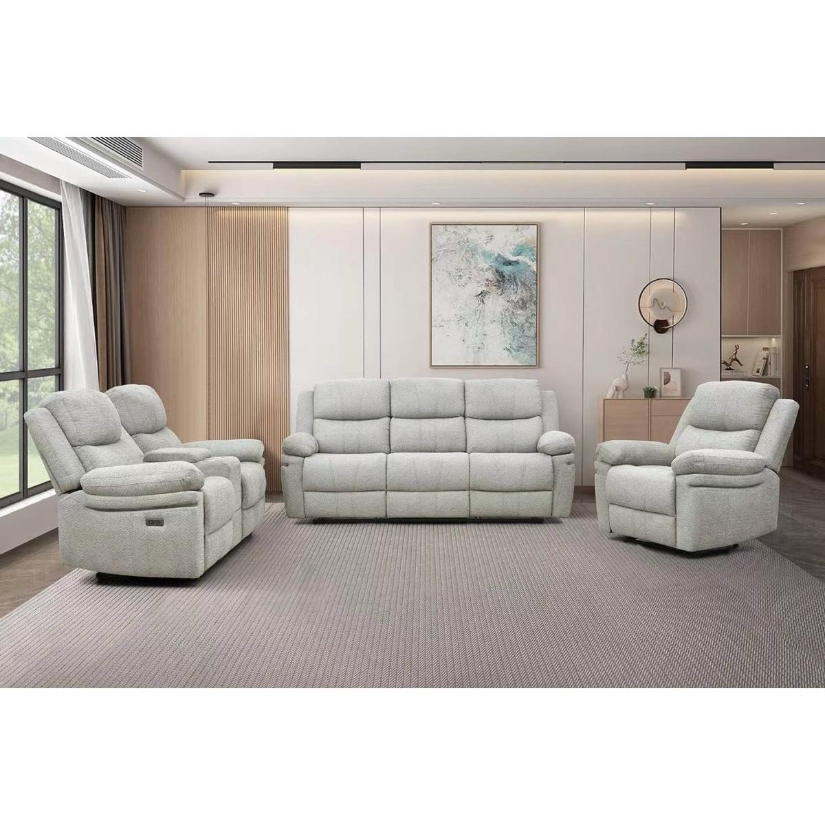 The Thea Recliner Sofa blends plush comfort with practical design, making it an inviting addition to any living room. Upholstered in soft, textured fabric, this generously cushioned sofa features high-back support and deep seating for ultimate relaxation. The dual power reclining seats allow you to kick back with ease, while the built-in center console offers convenient storage and dual cup holders—perfect for movie nights or casual lounging. With its padded armrests and clean, contemporary lines, the Thea Recliner Sofa combines everyday functionality with cozy sophistication.