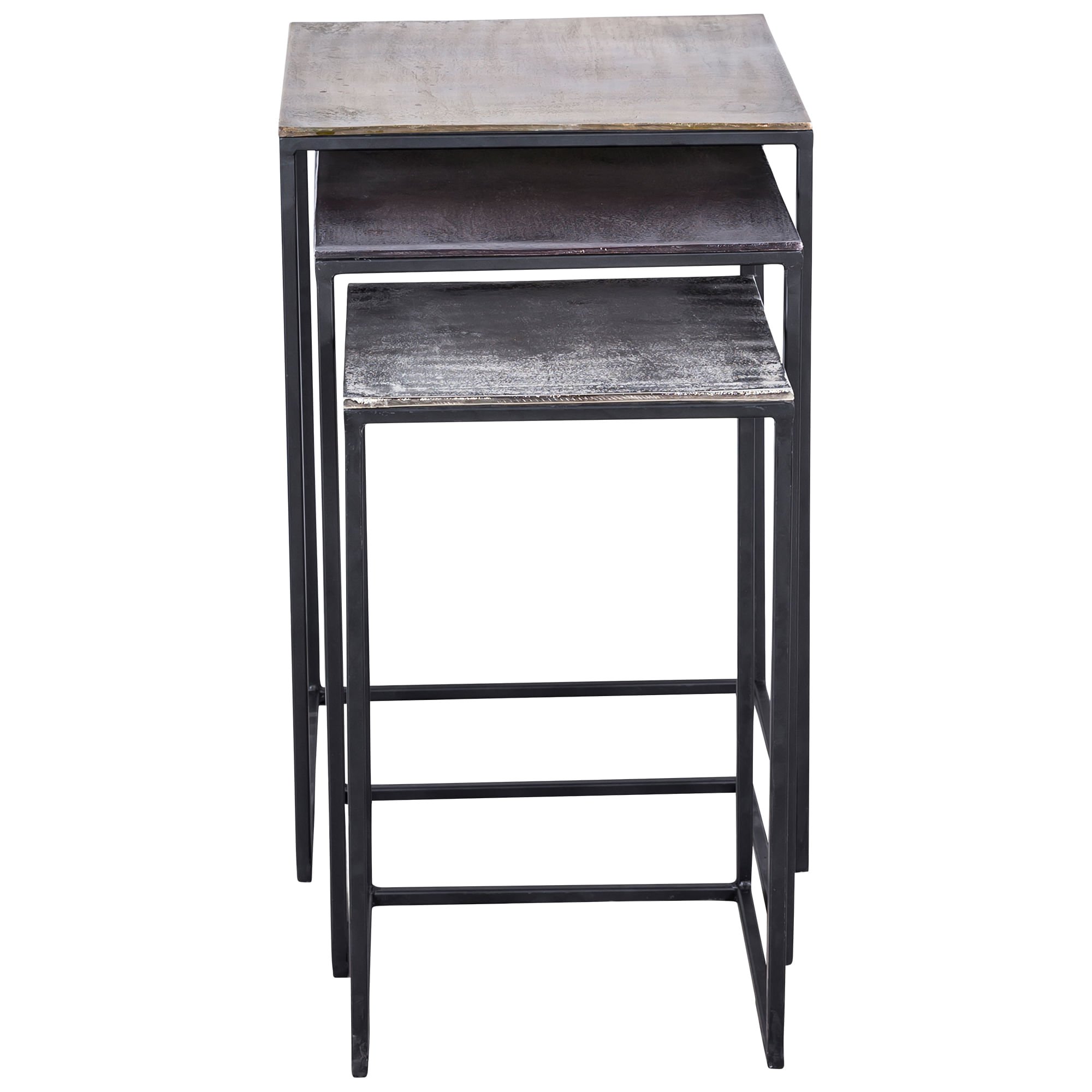 The factory style in this set of three accent tables favors simple shapes over ornamental embellishment. Multiple metallic finishes make the streamlined design of each aluminum and iron table a true standout, using antique brass, bronze and raw nickel finishes to add industrial luster to each square tabletop. The nested configuration maximizes tabletop surface area in small studio spaces and large lofts alike.