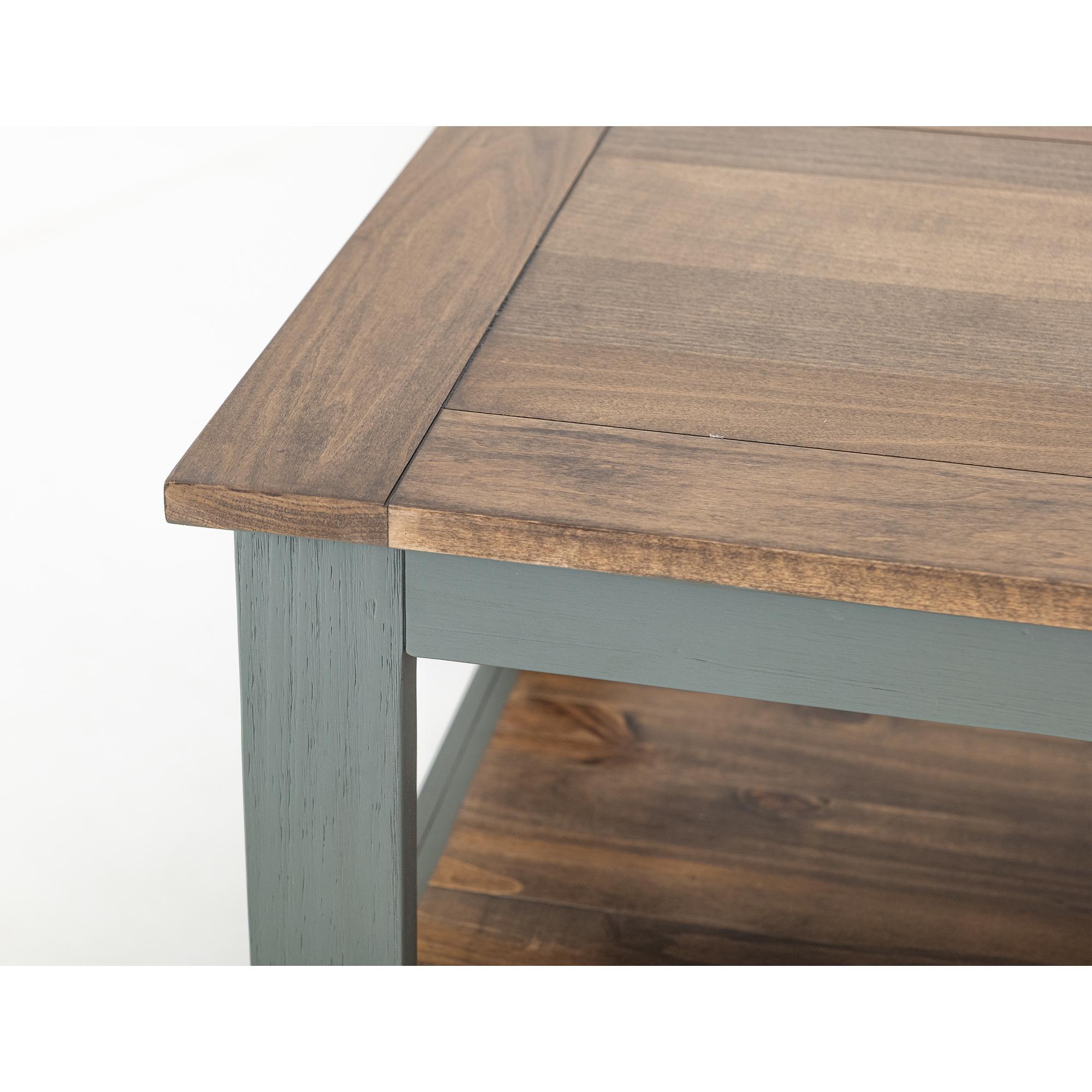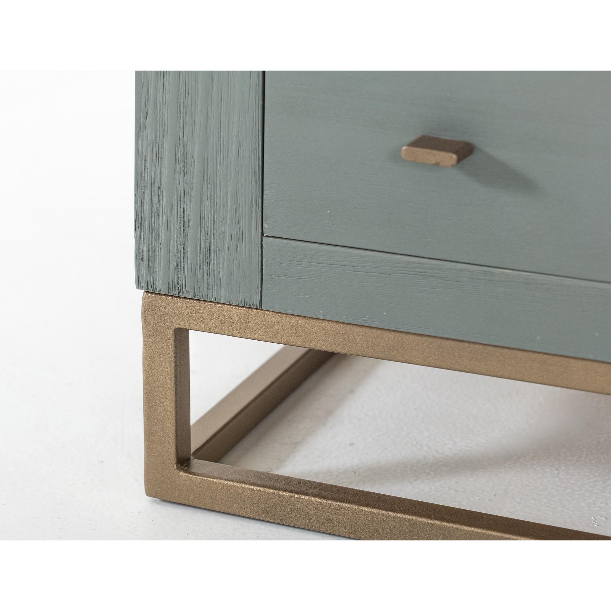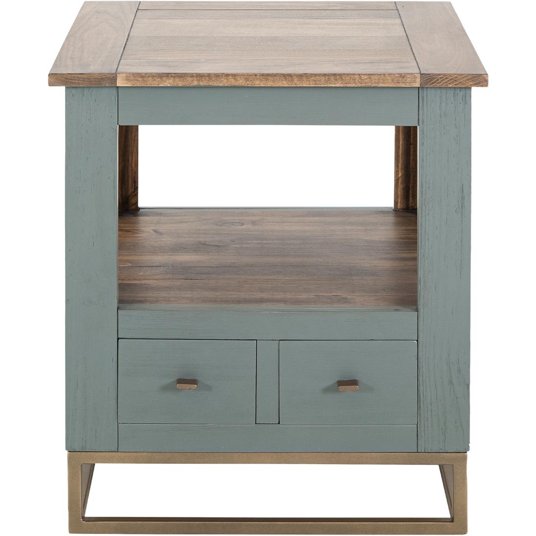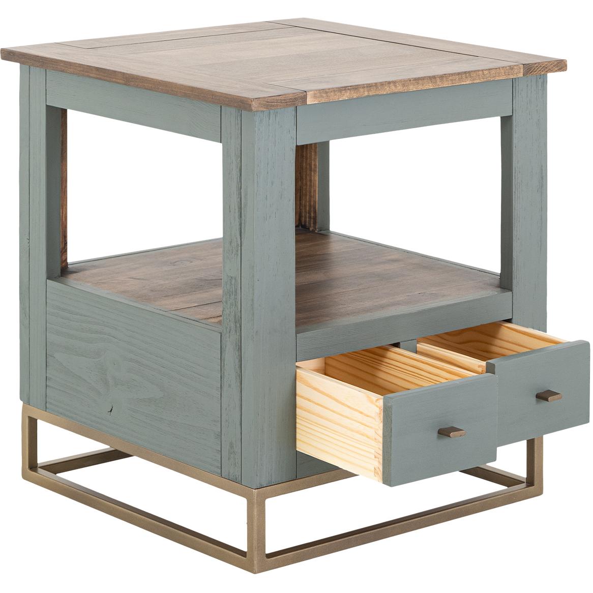 The Timber Occasional Tables are remarkable furniture pieces that beautifully combine functionality and style. Designed to enhance your living room, these tables are crafted from high-quality pine and poplar wood and showcase a rich, multi-step lacquer in an eye-catching green finish. They are accented by a hand-rubbed brown top that enhances the wood’s natural beauty. The end table’s square shape combines versatility and elegance. It features a convenient drawer for discreet storage and an open shelf for displaying decorative items or books. Its sleek gold metal base provides sturdy support and adds a touch of modern sophistication. The Timber end table is designed to complement the other pieces in the collection and enhance the aesthetic of any room.