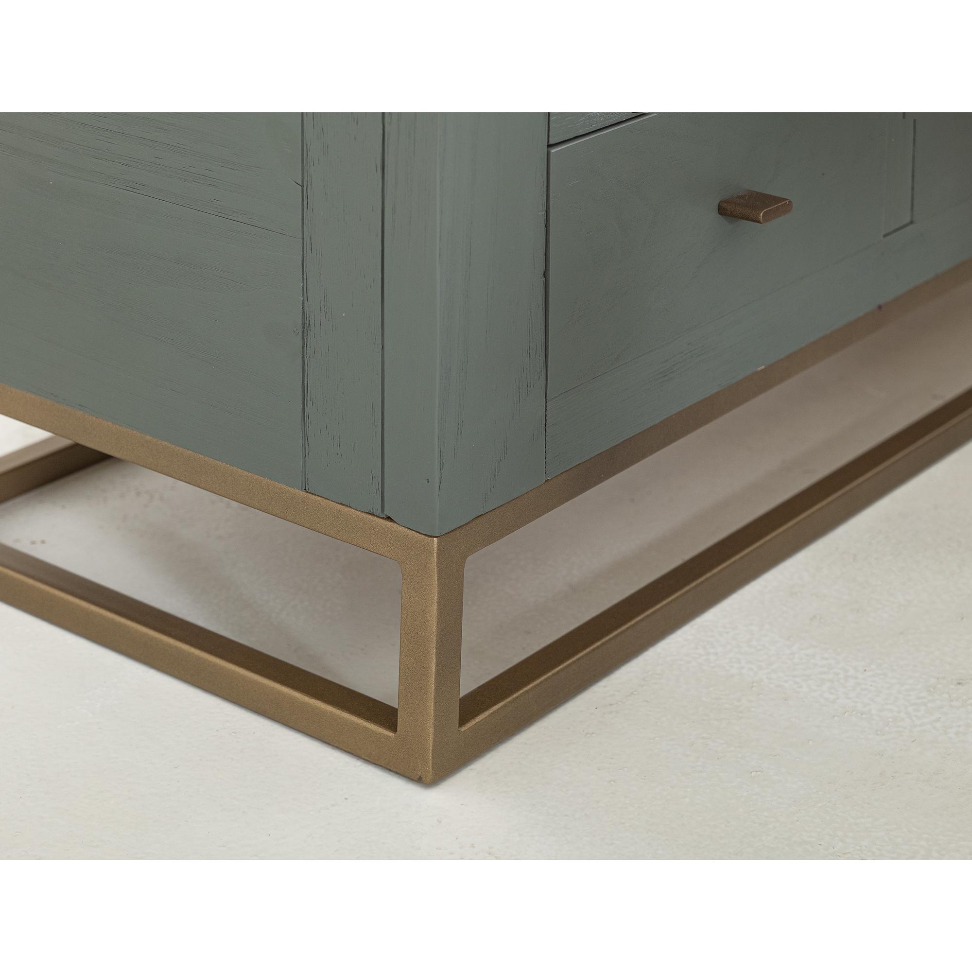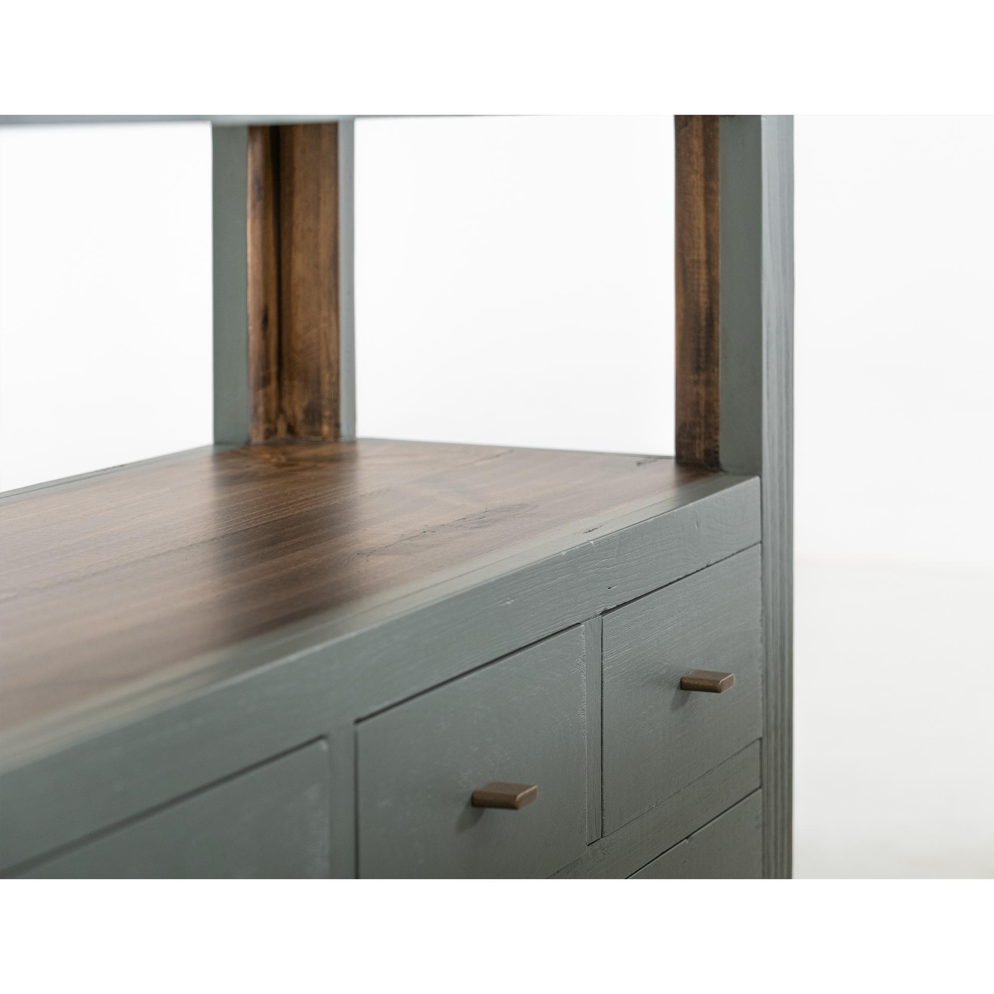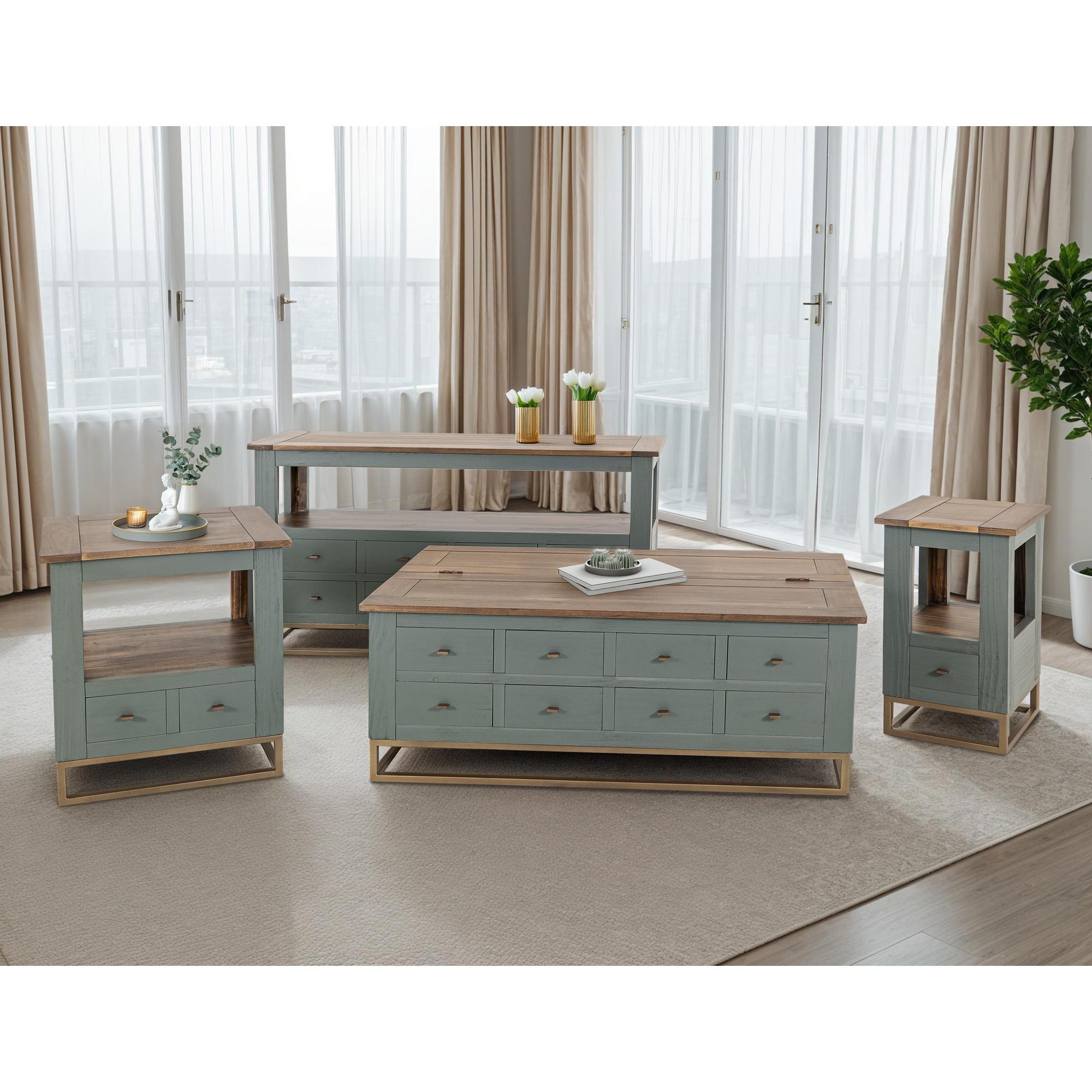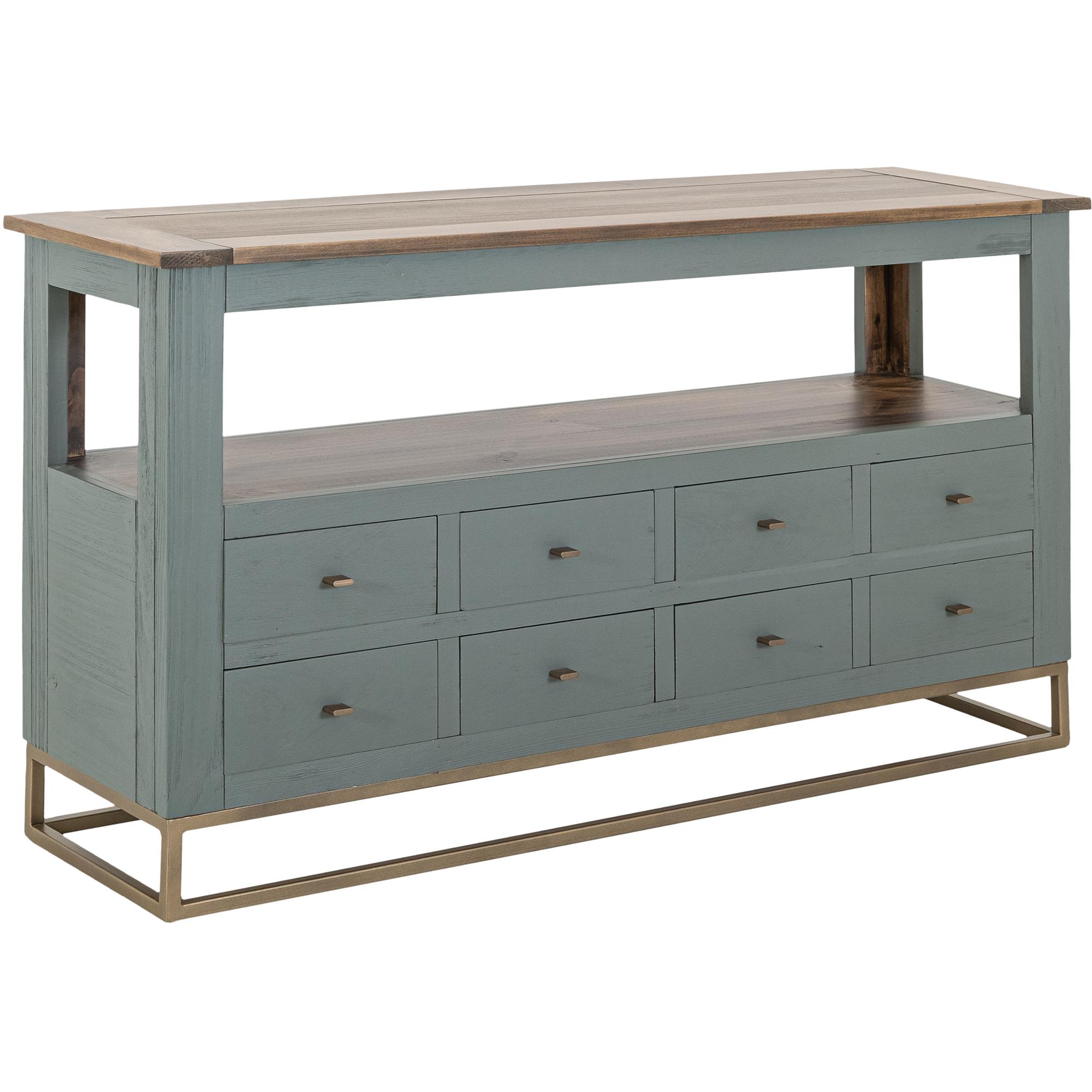 The Timber Occasional Tables are remarkable furniture pieces that beautifully combine functionality and style. Designed to enhance your living room, these tables are crafted from high-quality pine and poplar wood and showcase a rich, multi-step lacquer in an eye-catching green finish. They are accented by a hand-rubbed brown top that enhances the wood’s natural beauty. The Sofa table has eight drawers that glide smoothly on wood-on-wood slides and an open shelf below it. It is perfect for displaying décor or storing essentials, offering ample space for your essentials. Supported by a sleek gold metal base, the Timber Occasional Tables are an elegant and functional addition to any space.
