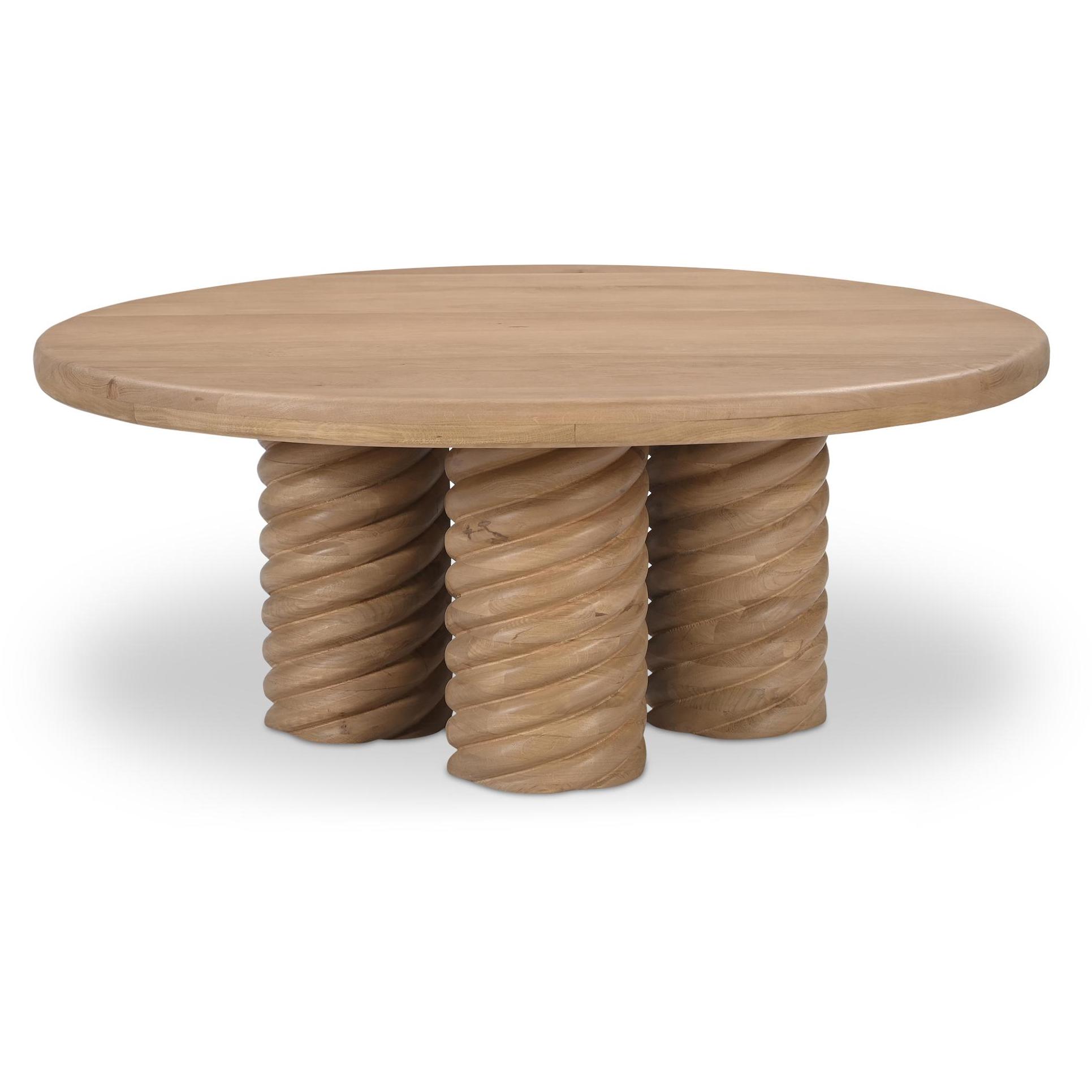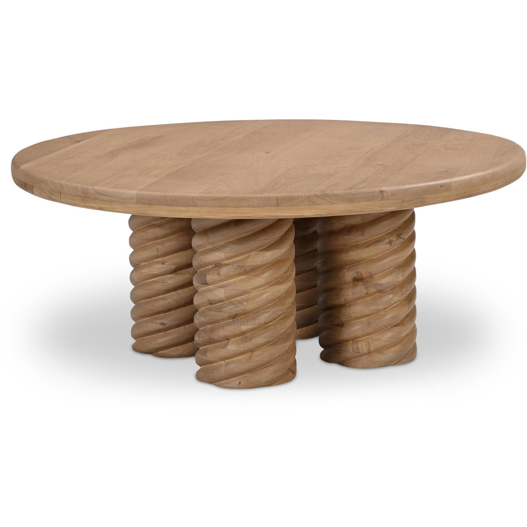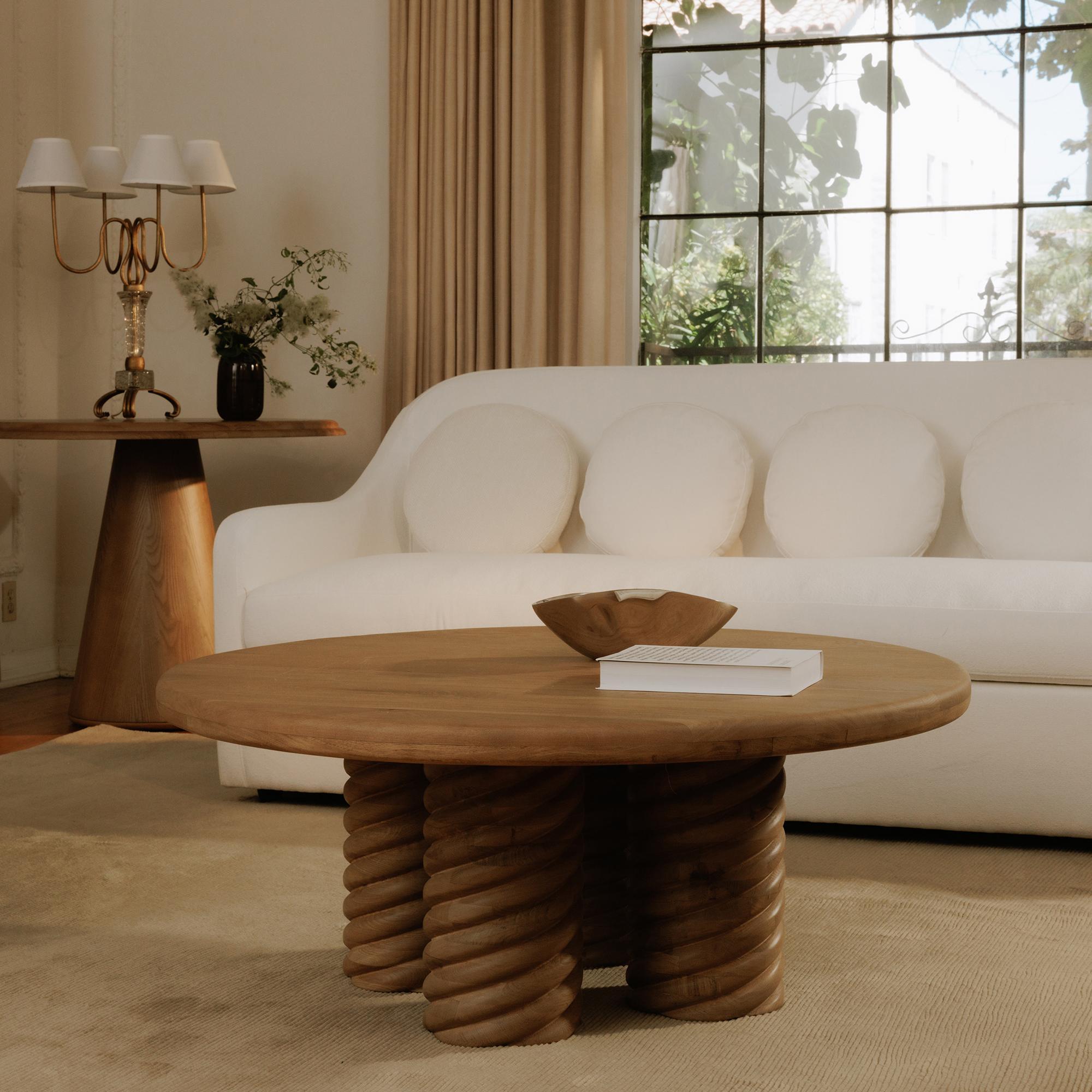 The Treccia coffee table embodies a contemporary reinterpretation of classical aesthetics, distinguished by its intricate turned and braided details. The table features an exaggerated, elegantly detailed pedestal base, presenting a bold modern twist while ensuring practicality. Its pedestal design is visually appealing and enhances functionality, creating a welcoming, uncluttered space for gatherings and everyday use.