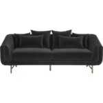 A beautiful sofa that exudes luxurious mid-century modern style. Designed with channel tufting on the seatback in shadow grey fabric or polo club muslin performance fabric and finished with antique brass metal feet. Comes with 6 cushions for added comfort.