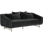 A beautiful sofa that exudes luxurious mid-century modern style. Designed with channel tufting on the seatback in shadow grey fabric or polo club muslin performance fabric and finished with antique brass metal feet. Comes with 6 cushions for added comfort.