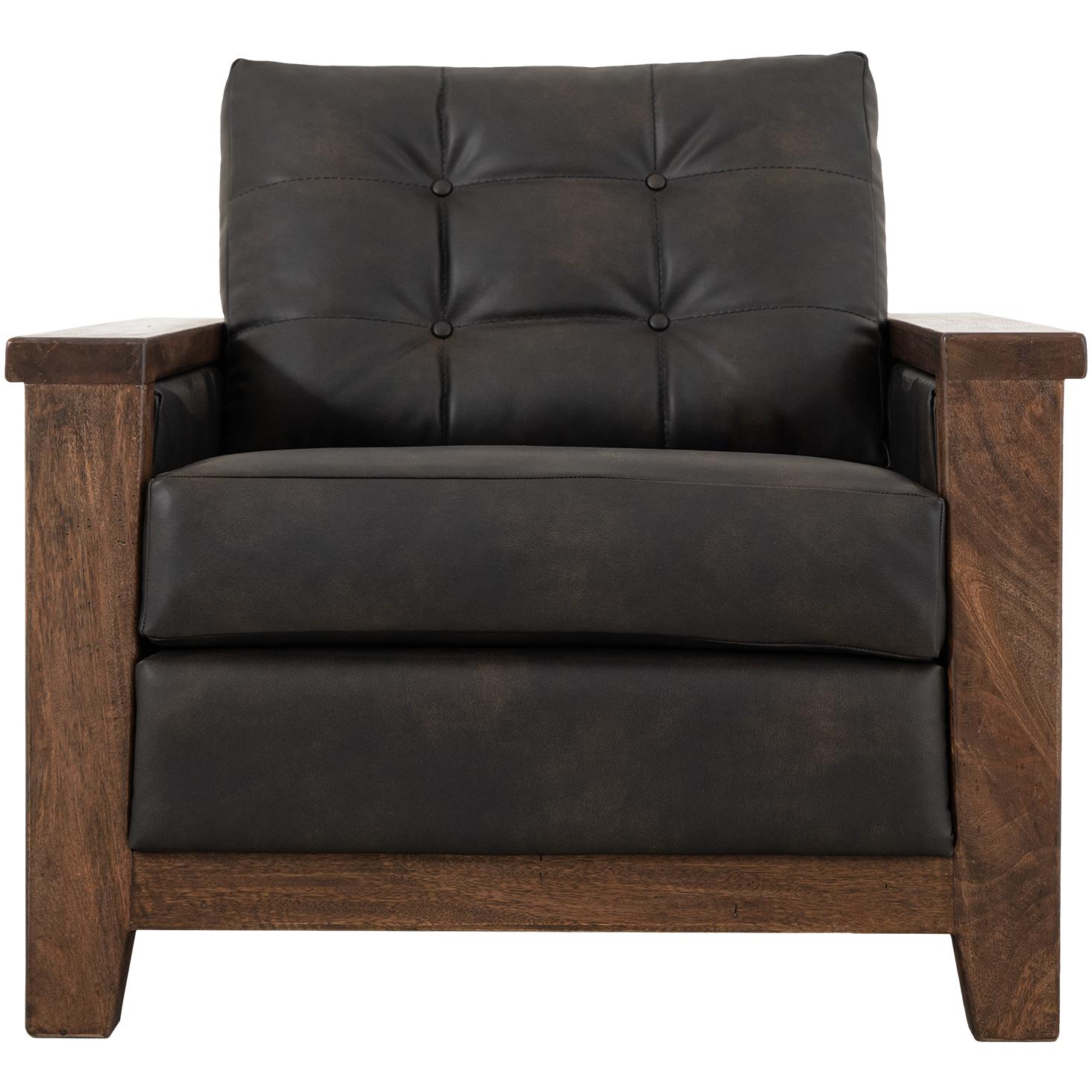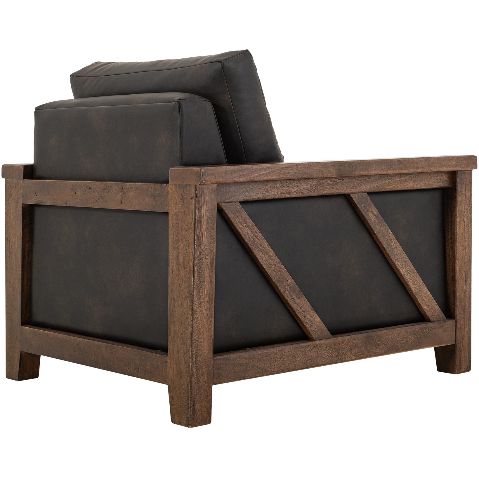Step into comfort and make this armchair the focal point of your living room. The Walnut armchair features a sturdy wooden frame with a rich brown finish and wide, flat armrests. Both the seat and backrest are upholstered in a dark, leather-like material. The backrest showcases a tufted design adorned with buttons, adding an elegant touch. Diagonal wooden supports on the sides enhance its modern rustic charm, blending the warmth of wood with the sleekness of dark upholstery.