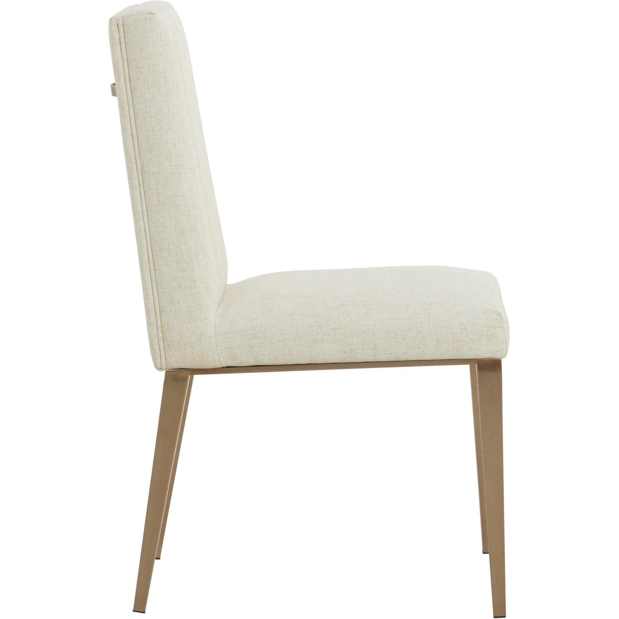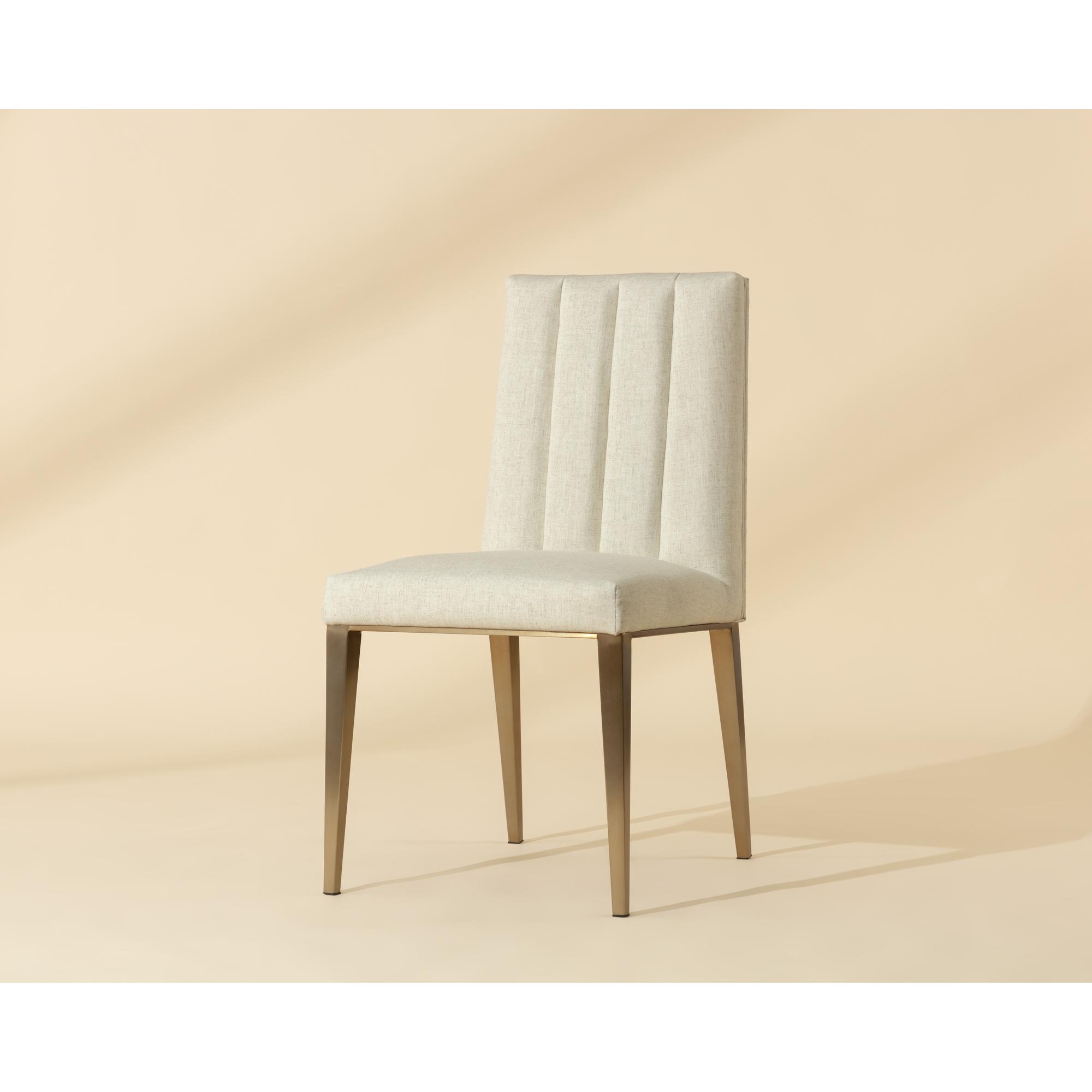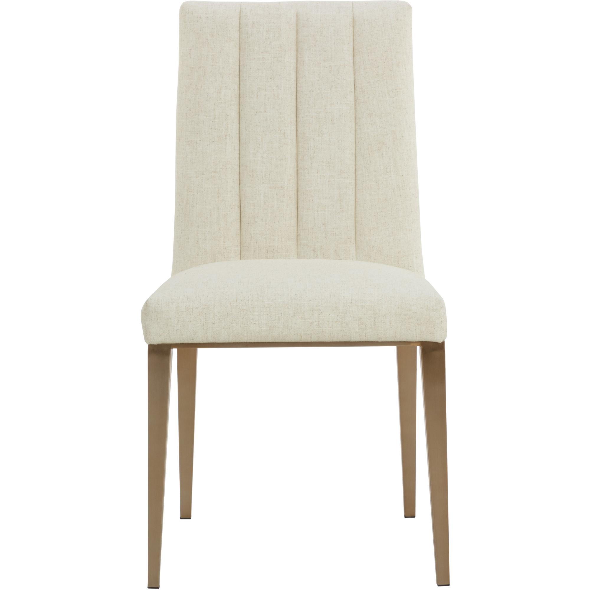 Minimal and classic best describes the Wilbur Dining Chair. Upholstered in geralt linen performance fabric with vertical channeling on the back seat for added flair. Finished with powder-coated stainless steel legs and a matching decorative handle.