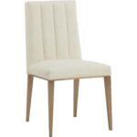 Minimal and classic best describes the Wilbur Dining Chair. Upholstered in milliken cognac faux leather with vertical channeling on the back seat for added flair. Finished with powder-coated stainless steel legs and a matching decorative handle.