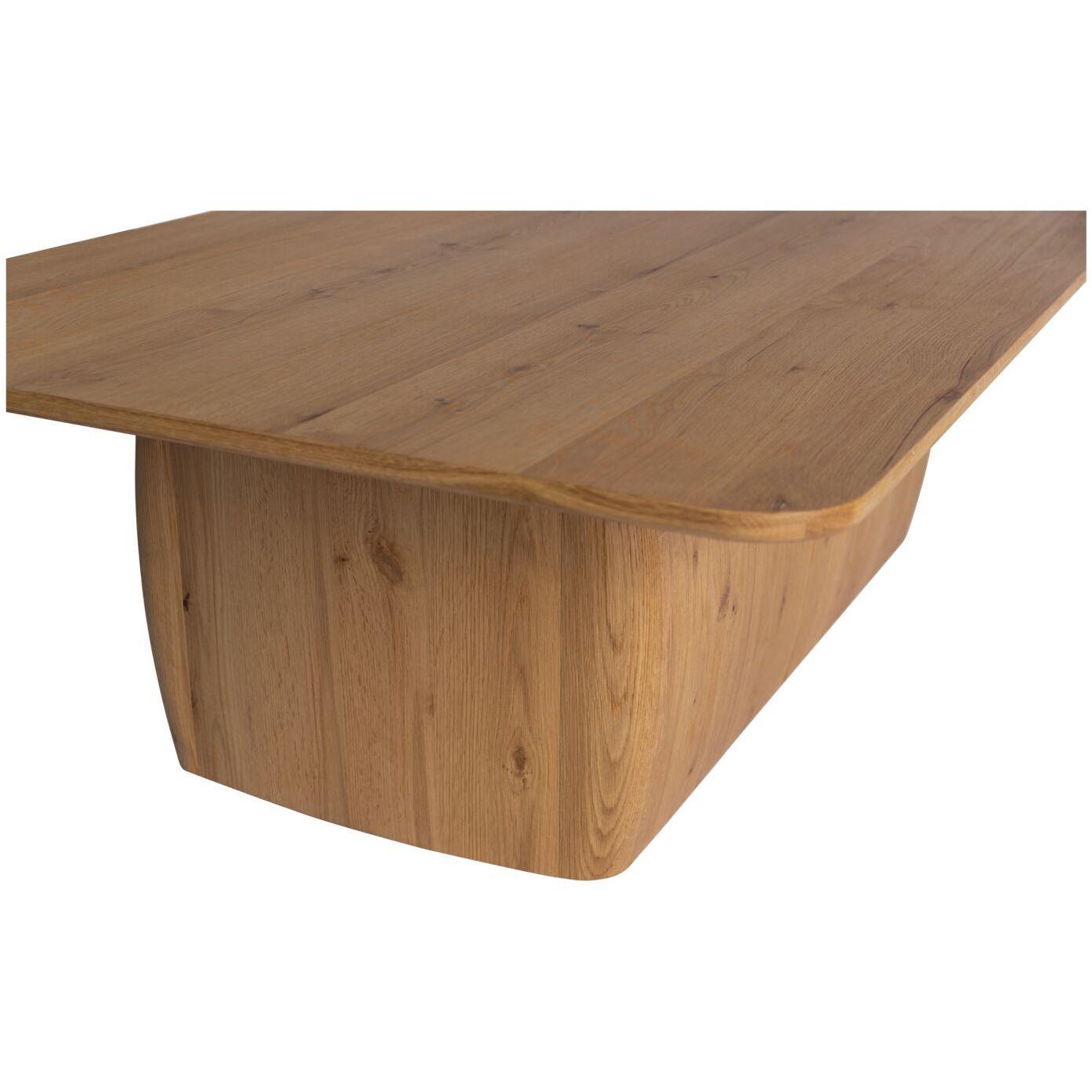 The Winston coffee table’s commanding plinth base features softly rounded edges at all four corners, offering a hefty, substantial design poised to be the centerpiece of any space. Finished in a rustic oak veneer with expressive knots highlighting the wood’s natural charm, it crafts a striking contrast between old and new.