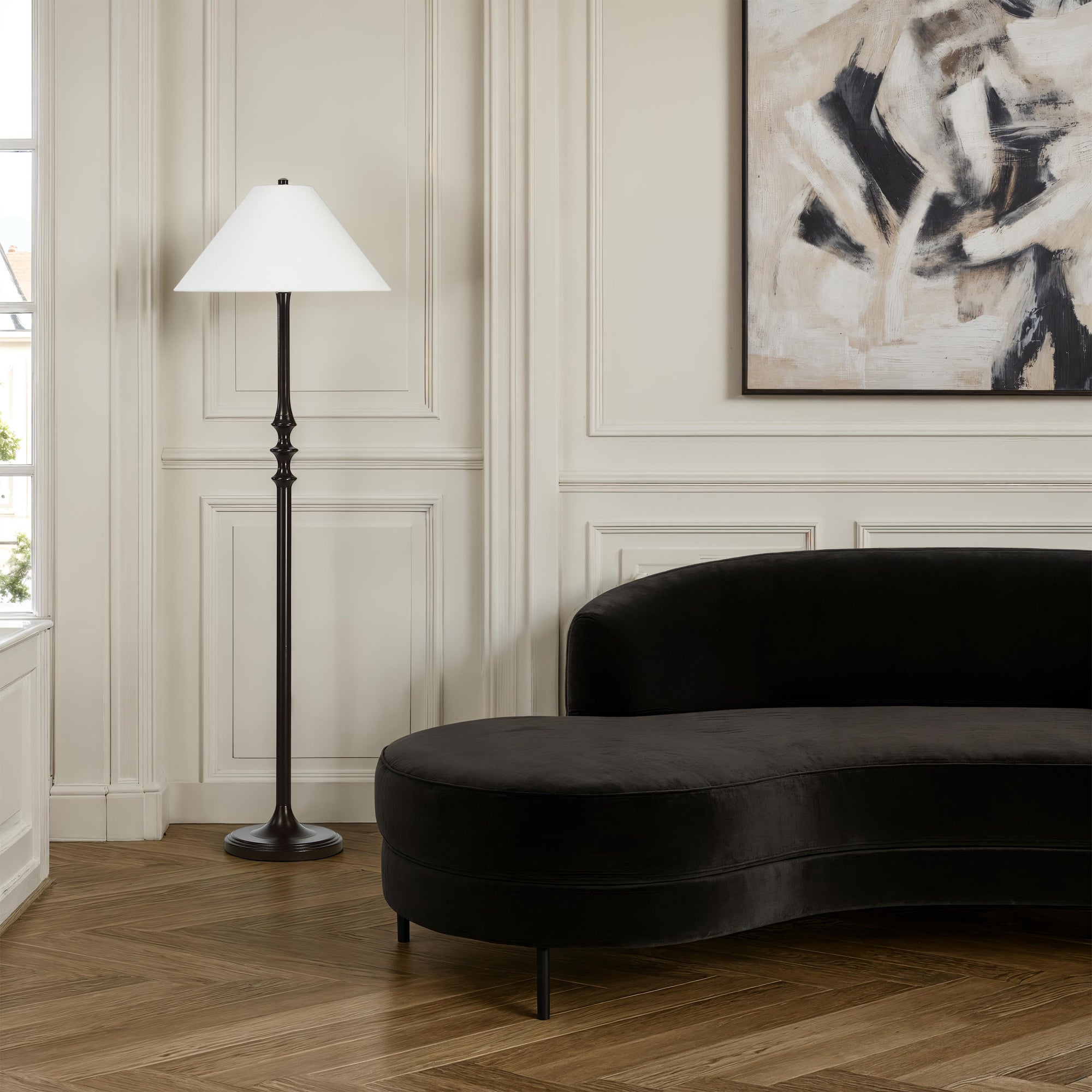 Designed to complement everything from modern to transitional decor, the Zyra floor lamp brings effortless style to any room. Its streamlined iron base is finished in a matte dark bronze that pairs beautifully with a clean off-white linen drum shade. The result is a versatile look that’s perfect for showcasing your classic design sense.